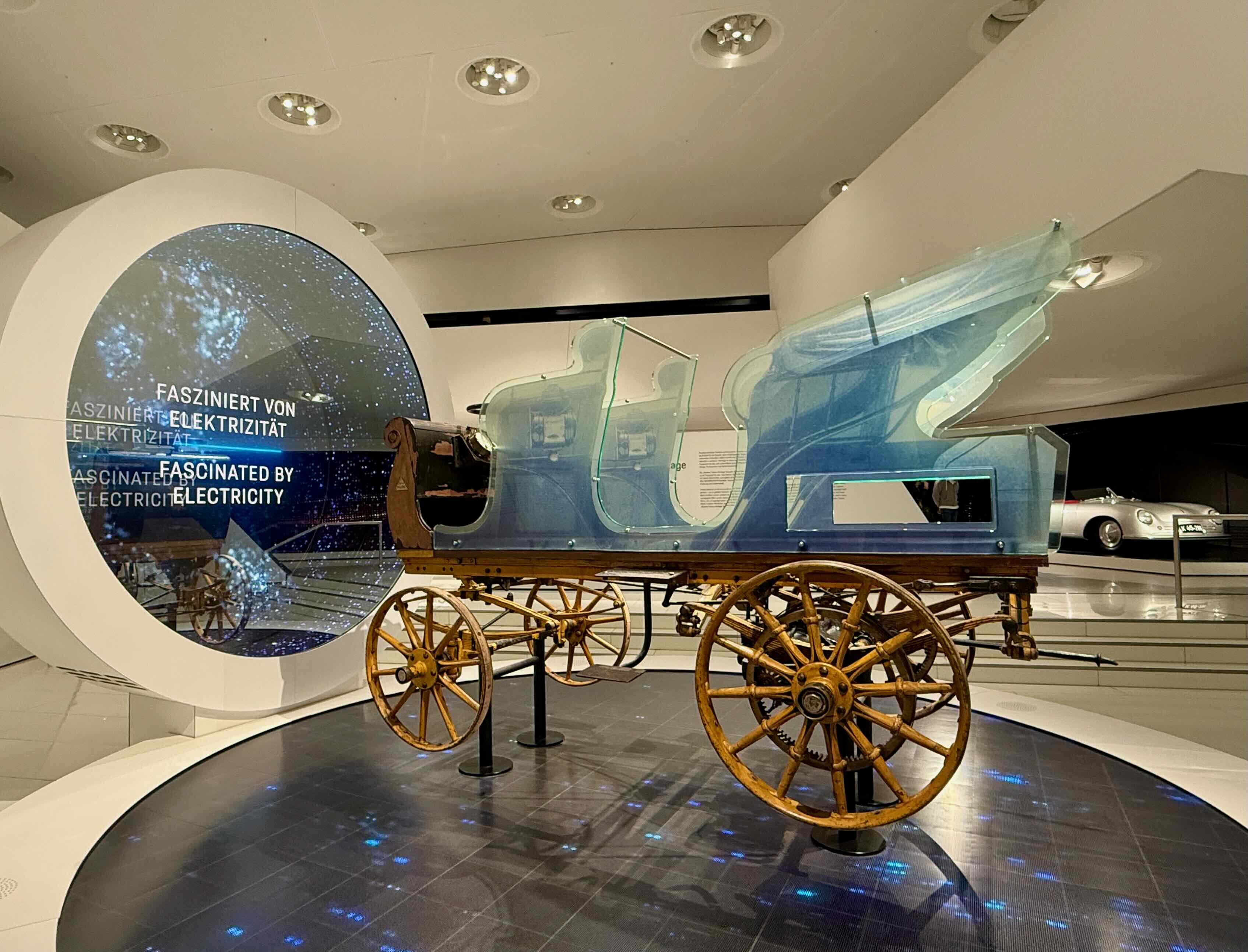 The Lohner-Porsche ‘Semper Vivus’ from 1900 was the first hybrid vehicle with a gas engine that powered an electric generator supplying power to the electric motors mounted in the front wheel hubs.