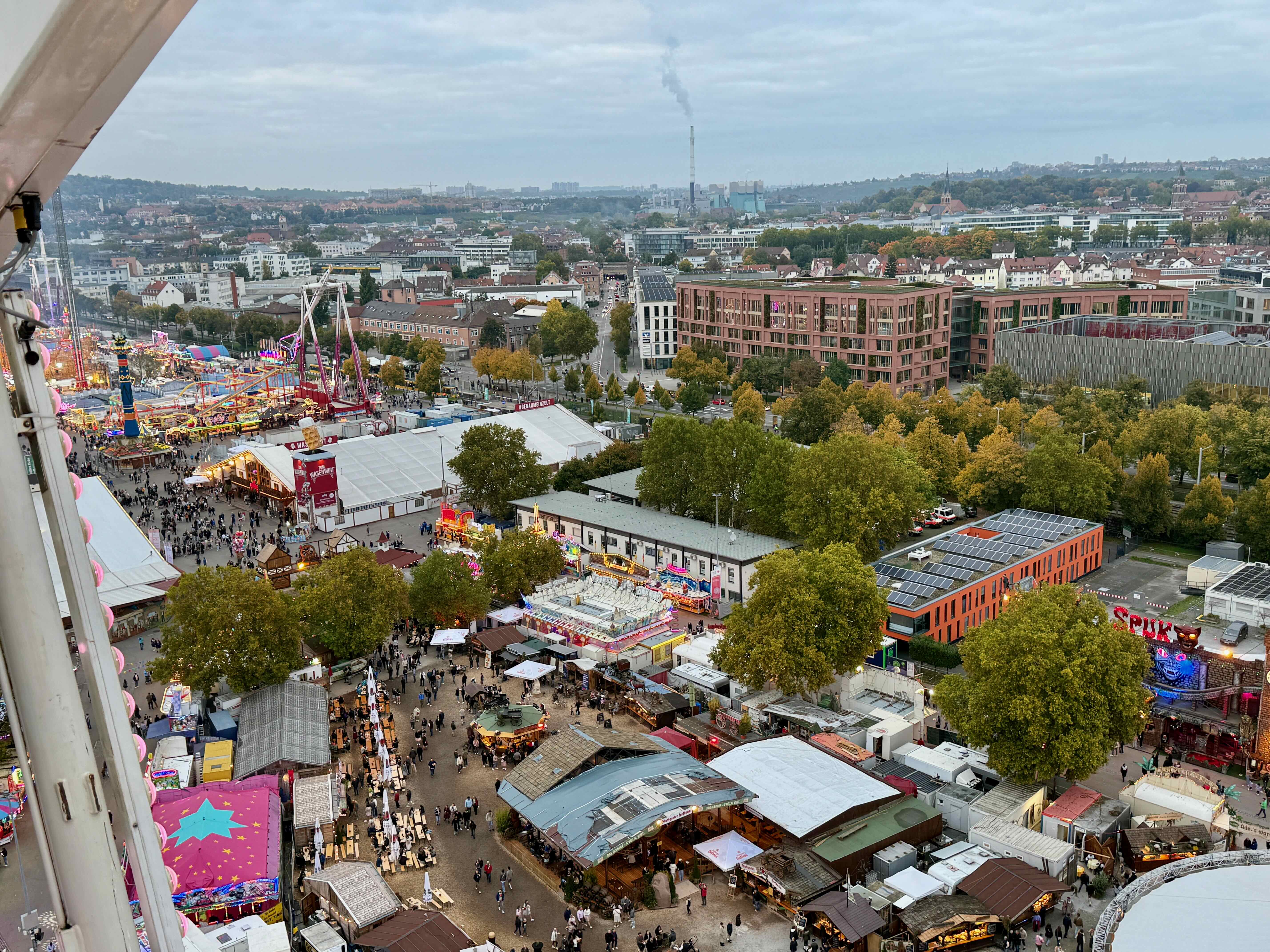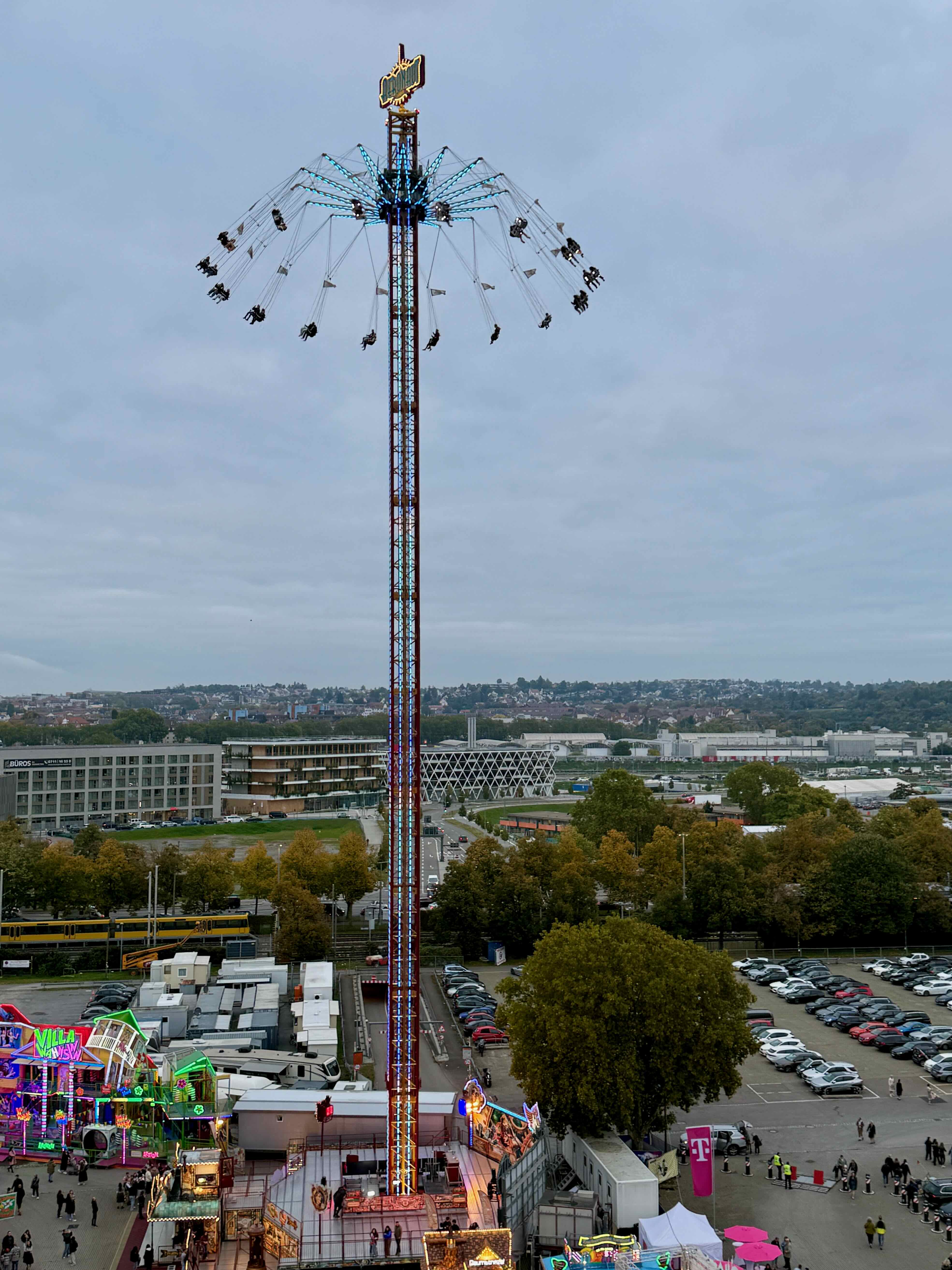 We can see one of the Cannstatter Volkfest ferris wheels (from our visit yesterday) and some of the other rides from up here!