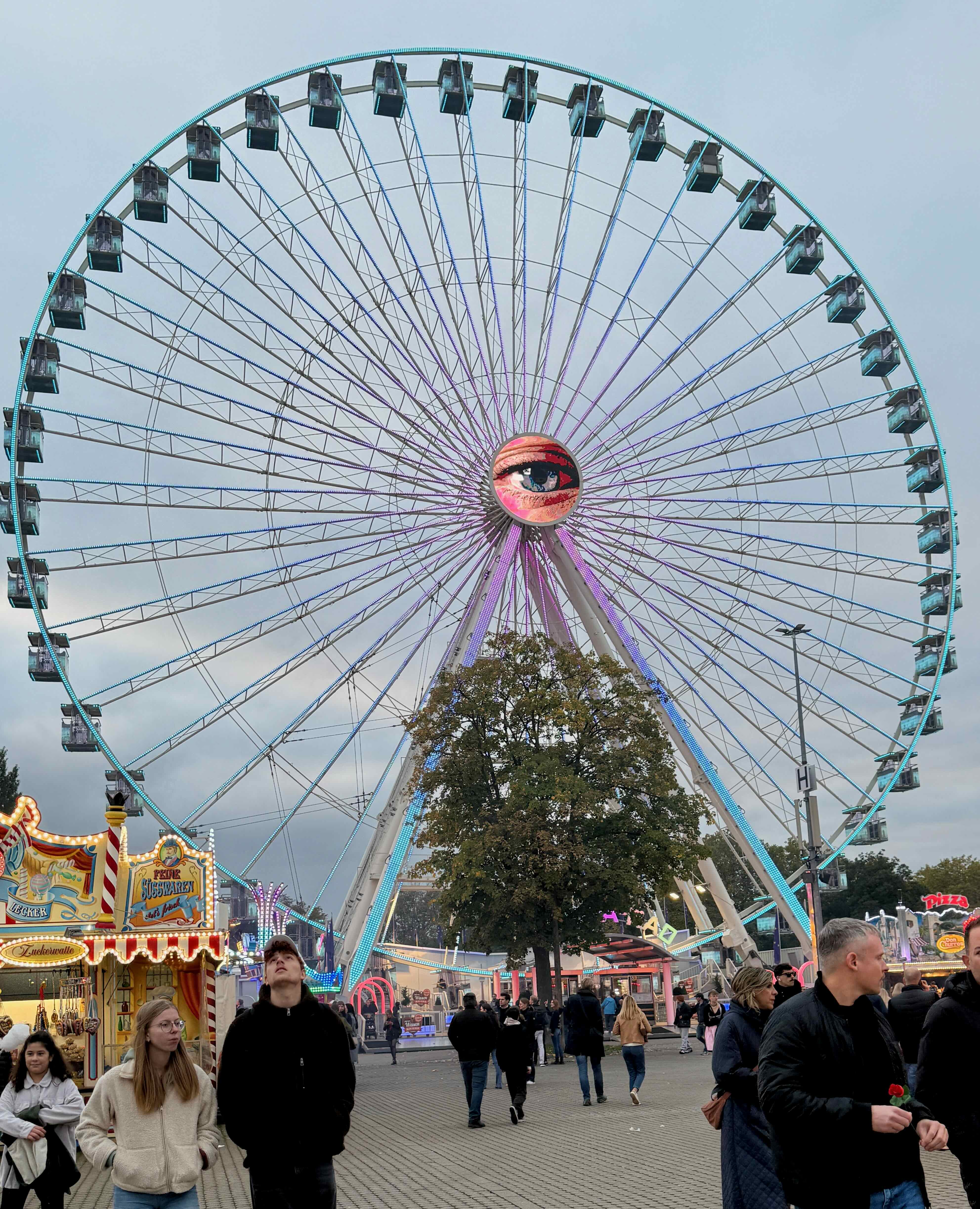 After our ride we notice the changing colours on the ferris wheel, done with 1000 LED lights! The centre circle changes too, and we both thought this eye was quite striking.
