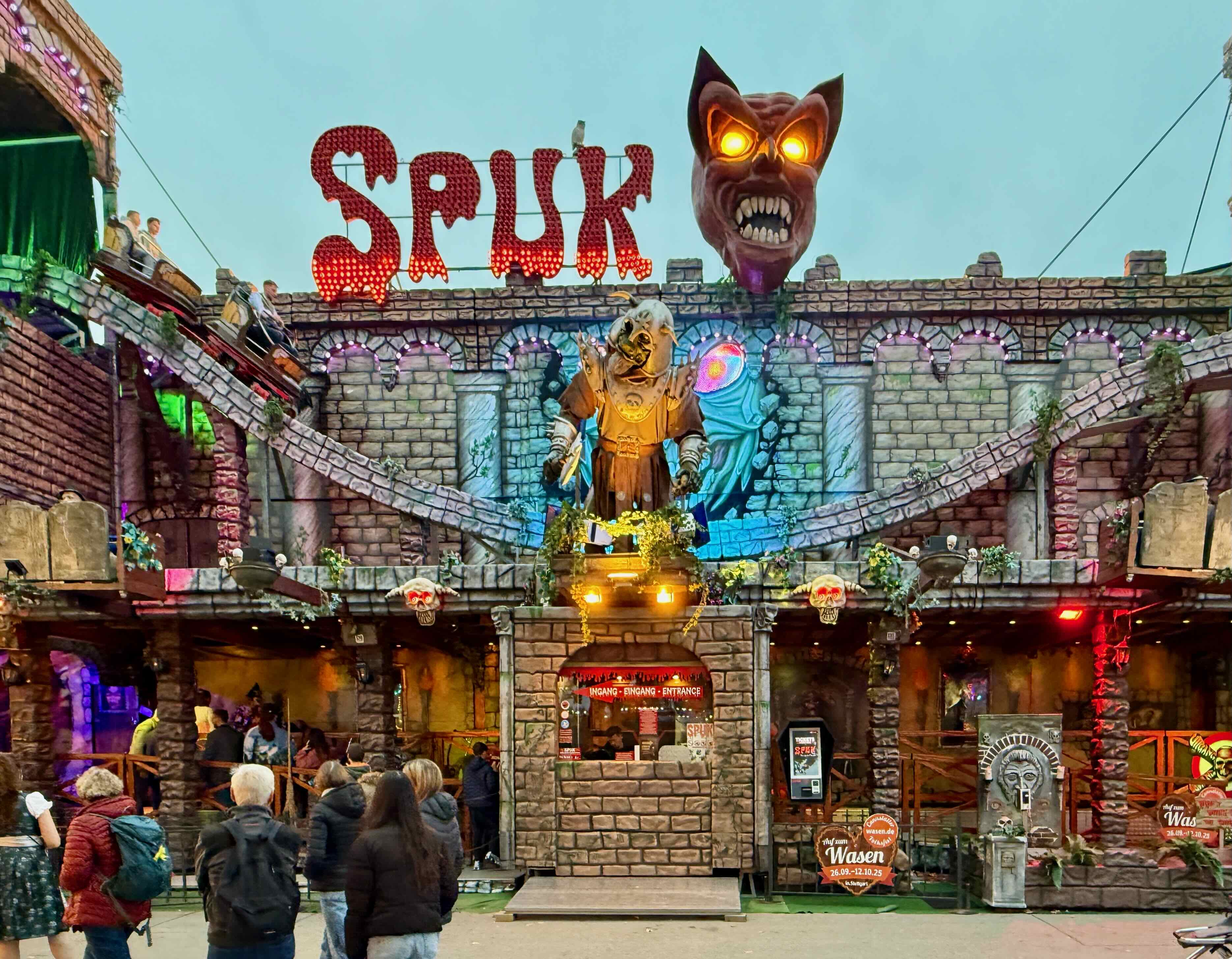 The fun houses here are huge and very ornate. This photo captures about one half of the length of this one.We liked the flying witch, the dragon, and the ghost in the window.