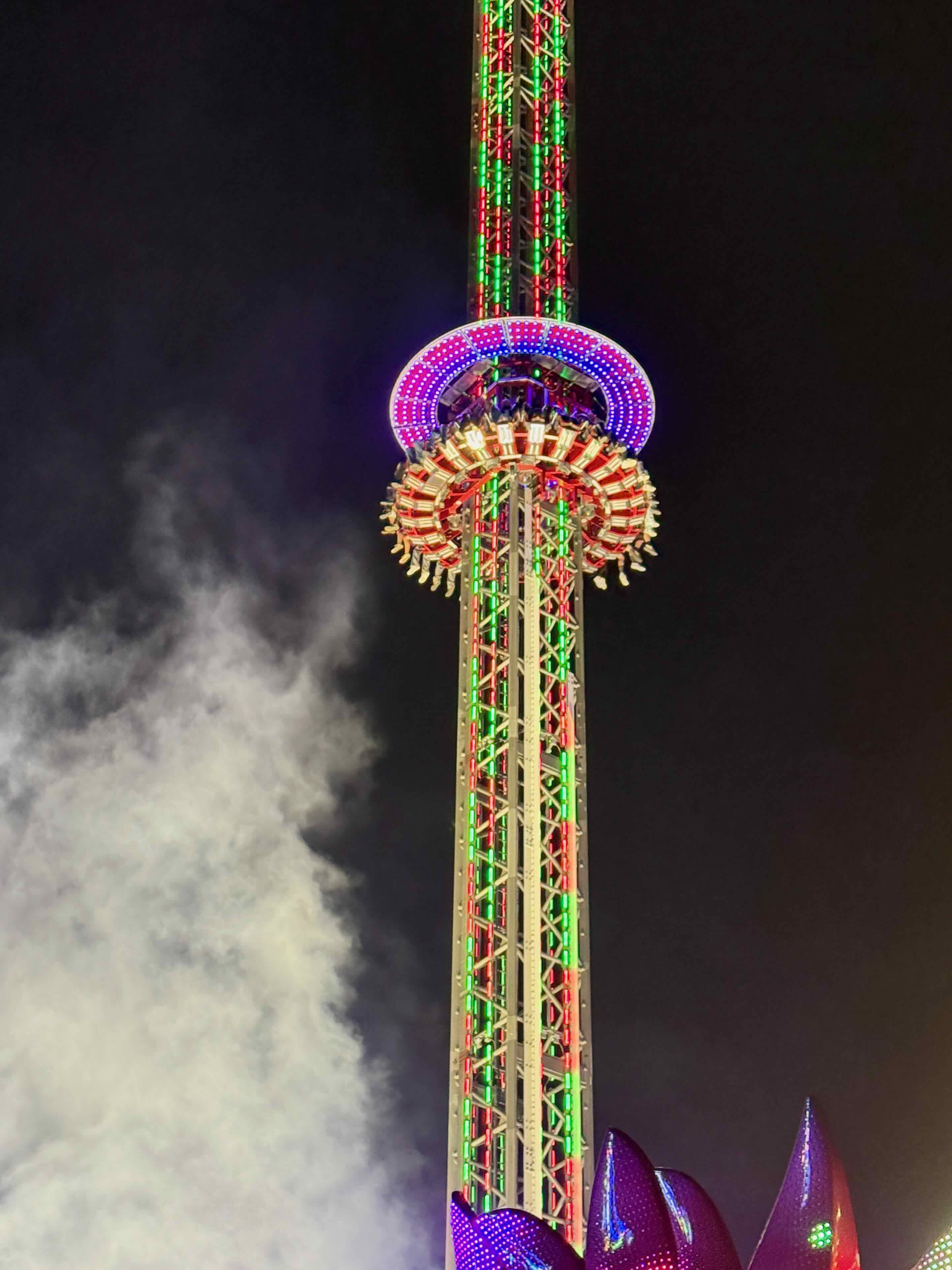 We are quite content walking outside and looking at the rides and all the people having fun. At home this ride is called the Drop of Doom…it is pretty colourful! Those are people’s feet hanging below their seats as they ride up to the very top of this tower, and then plummet to the bottom!