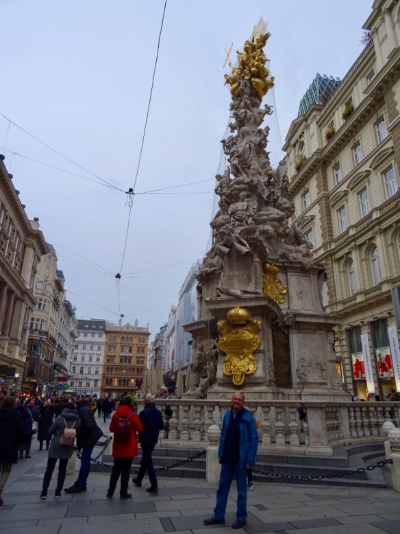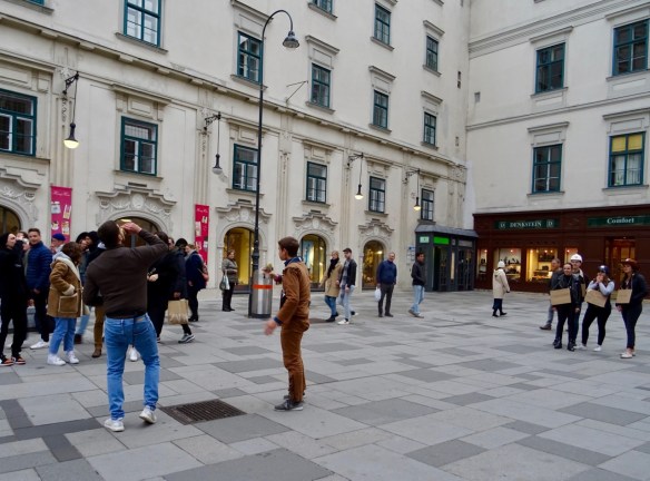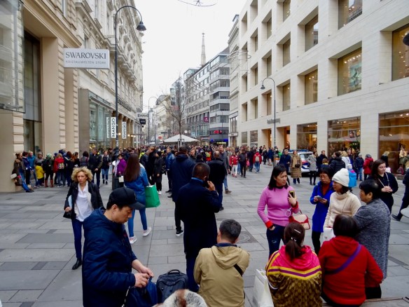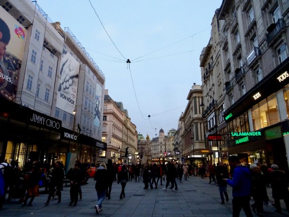 This broad pedestrian Kärntner Strasse is packed with people and lined with shops and places to eat. This road dates to 97AD when it was a Roman road that went from Vienna to the border of Italy and Slovenia, and eventually all the way to St. Petersberg, Russia!
