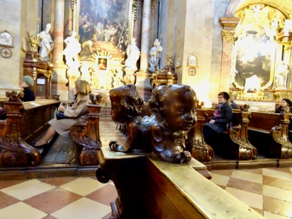 The end of each pew is beautifully carved with different finials of three children’s heads. We sat for quite a while listening to the choir practicing.