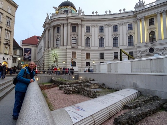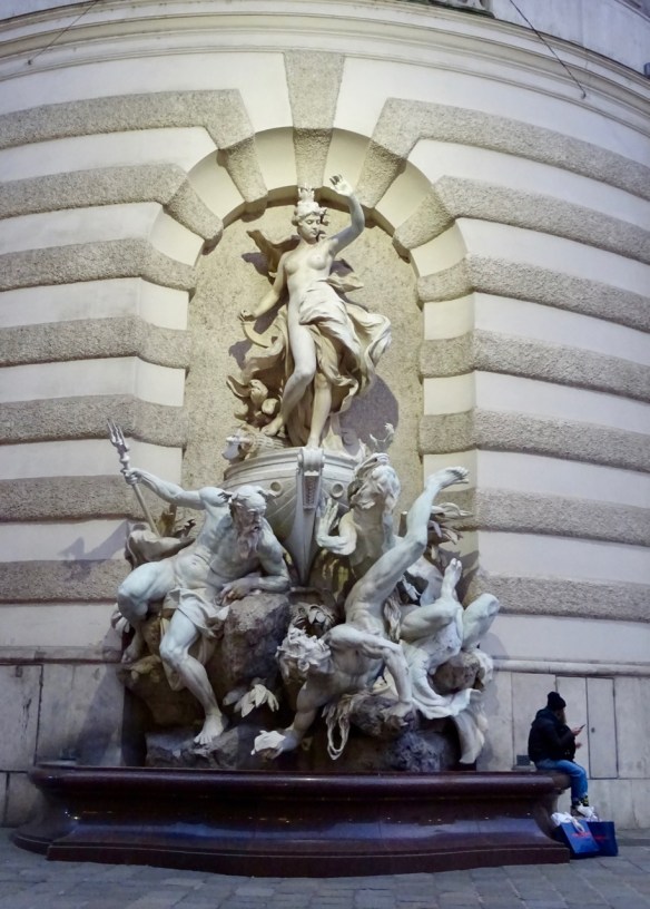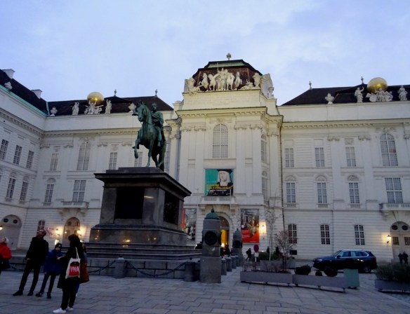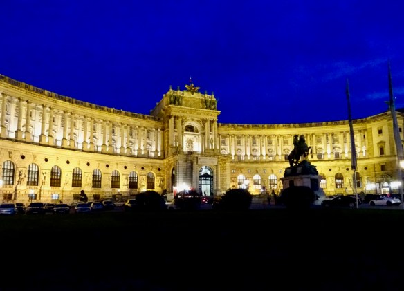 It gets dark earlier now, at about 5;30. The buildings look pretty all lit up. This is the other side of the Neue Burg Wing of the Hofburg Palace. We saw the backside earlier in the day.