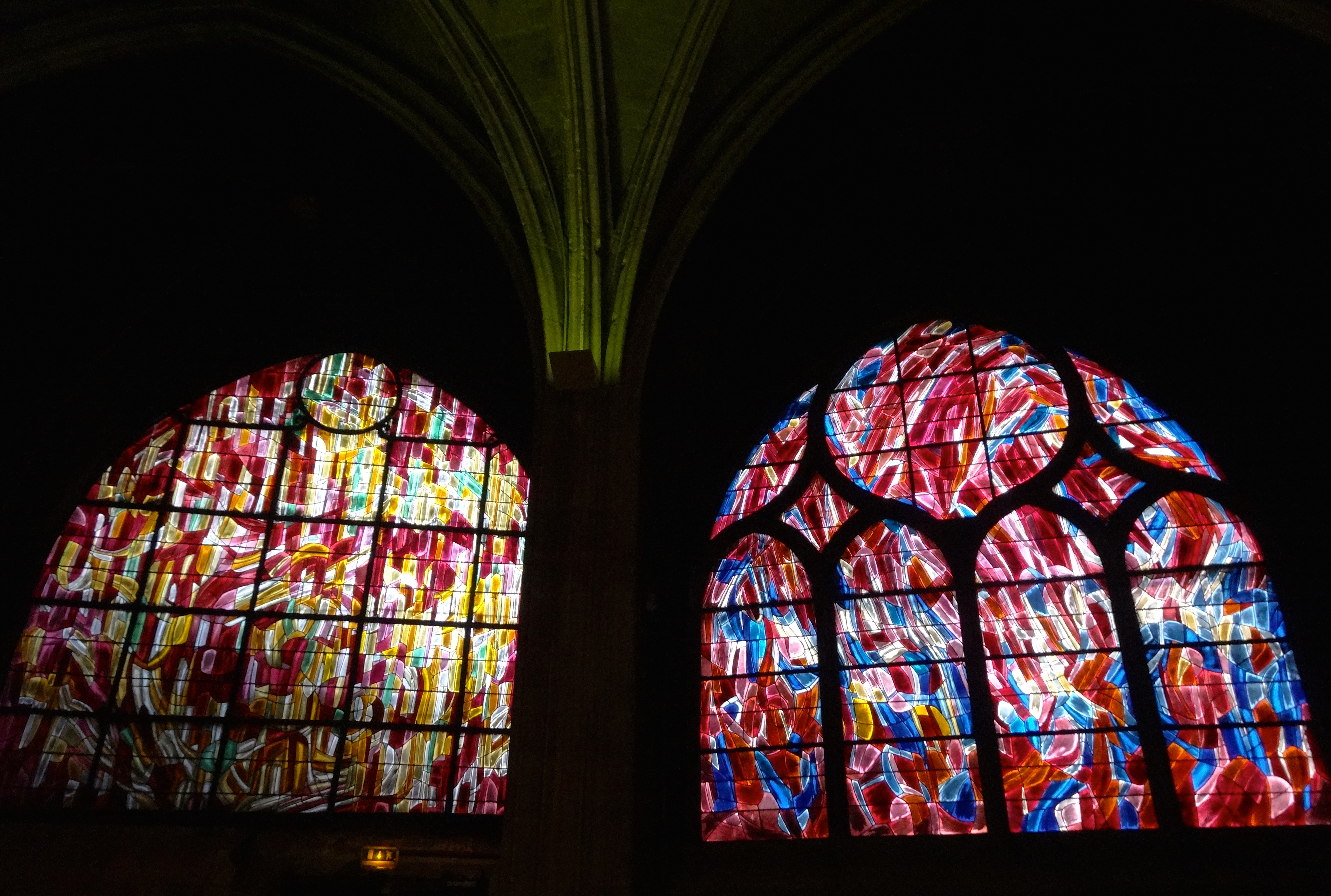There are a set of seven stained glass windows inspired by the seven sacraments of the Roman Catholic Church. These two are the Wedding (with yellow tones) and the Confirmation (with red tones) designed by an artist named Jean René Bazaine in 1970.