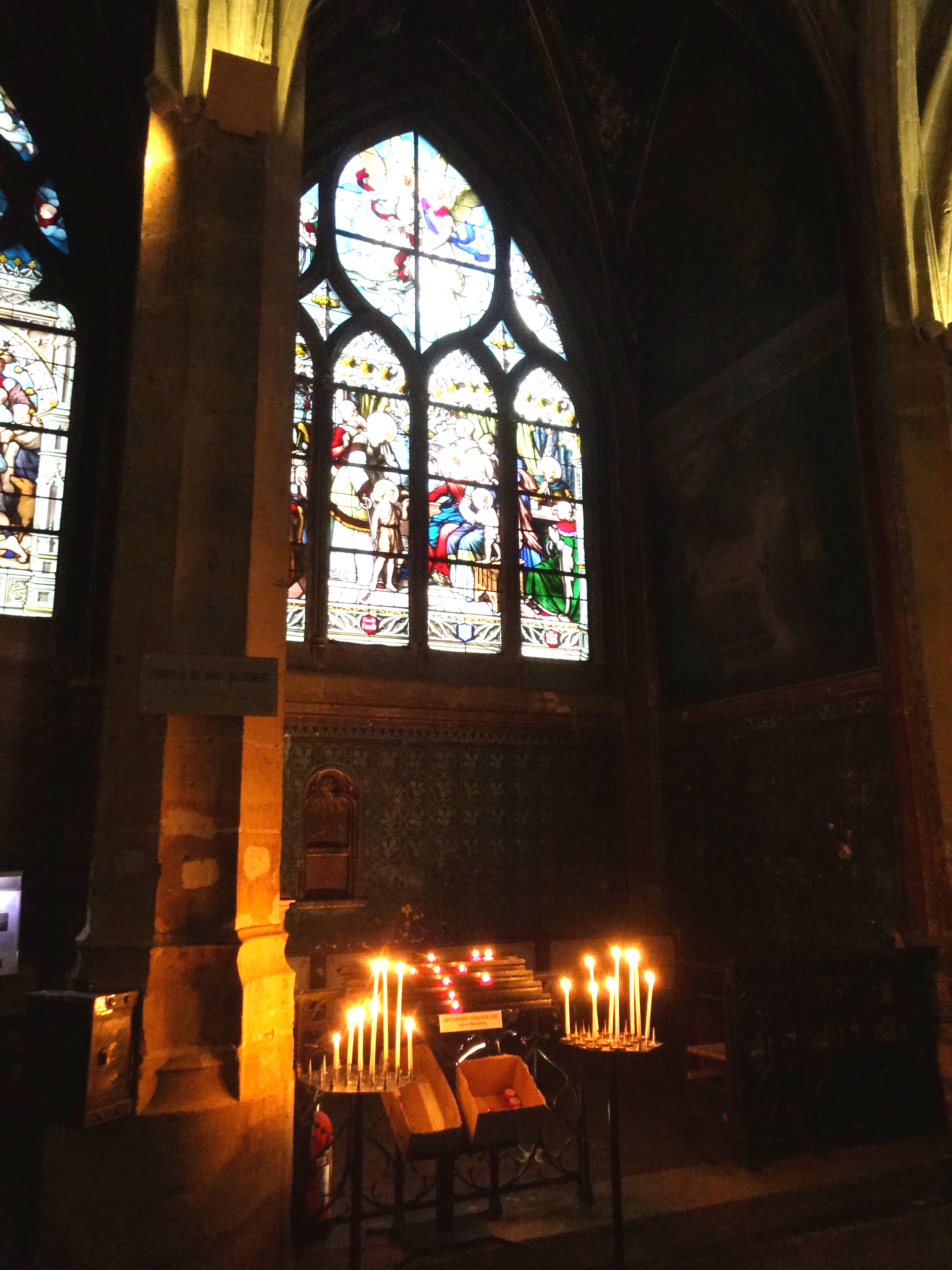 I find it interesting how the old churches are surrounded by other buildings and shops. This is Sainte-Séverin. It is very dark inside and it has beautiful ancient and modern stained windows.
