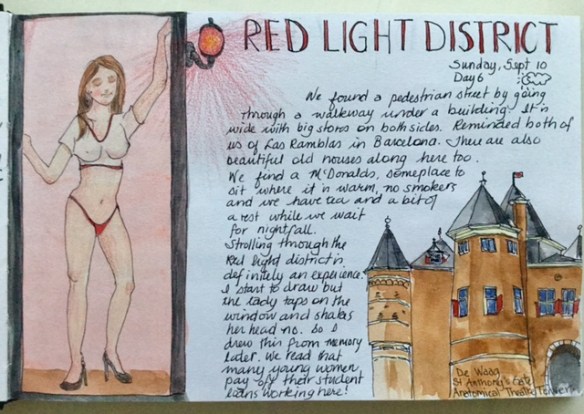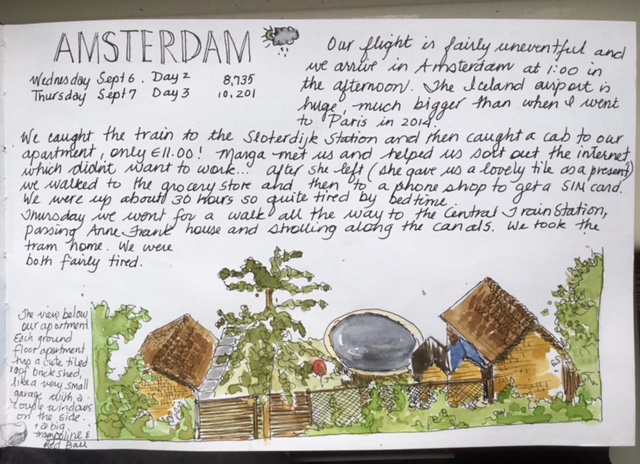 We get sidetracked, (lost) and end up on the backside of the cathedral, so we sit to have little rest and a snack on a park bench, I draw this view while Bob amuses himself with a Games magazine.