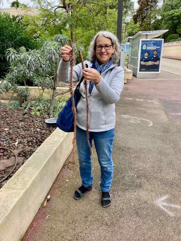 We are in the French Riviera!  We thought it would get warmer and sunnier the further south we went, but not so…today is cloudy and only 21°.  On our way to the beach I notice these strange cones from some type of coniferous tree, no idea what they are but they were very prickly!