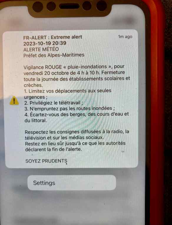 “Météo France has upgraded its storm warning for the Alpes-Maritimes to a red alert – while the Alpes-Maritimes préfecture has ordered all schools and town halls to remain closed on Friday.