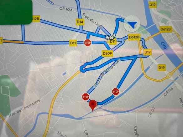 Today we travel from Carcassonne to Cannes.  It is a 4 1/2 hour drive if we use the toll highway and 7 1/2 hours without so we decide to pay the tolls.  We make a side trip to Beziers to visit the Fonsernes 9 Locks.  On our way there we drive by a very strange design on Google maps… I wonder if it might be some sort of irrigation system?