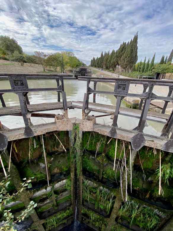 ‘The Étang de Montady, or Pond of Montady is a drained pond or lagoon.. It was built by monks and wealthy Béziers landowners during the second half of the 13th century. The Étang de Montady was drained to provide farmland by making radial ditches from a single center point out to the extremities.  The water flows to this center point and is then drained by sixteen vertical shafts to an underground culvert.’~ info from Wikipedia.