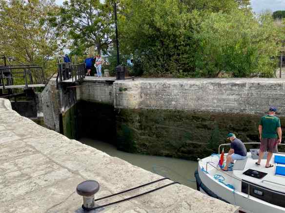 Soon the water levels in the two basins are equal and the lock gates open…