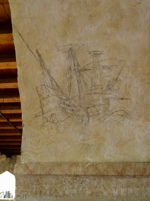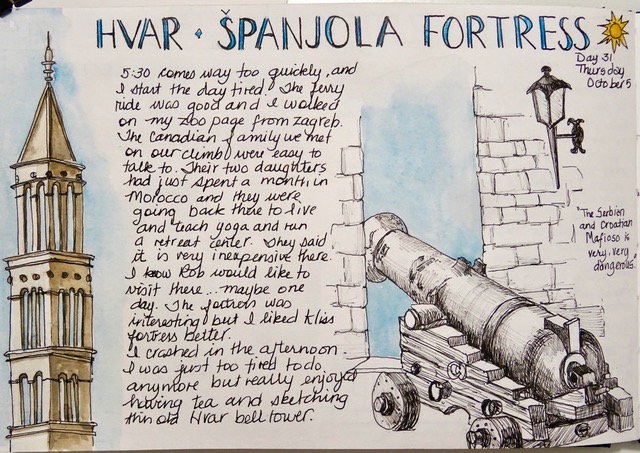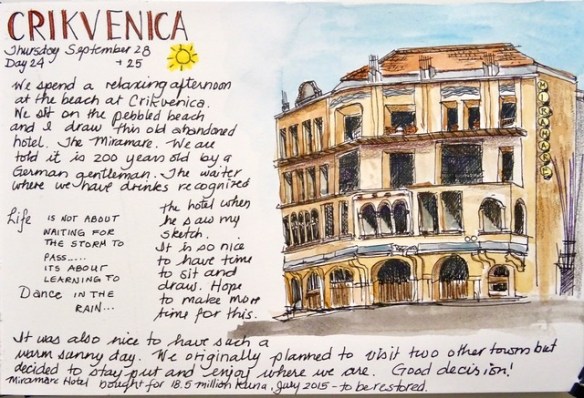 We go for another little walk and find this tiny church which was built in the 17th Century and dedicated to St. Jerome. It is right beside a big hotel named the Grand Hotel that is abandoned and not so grand at all.I rent a beach lounge chair and draw our ship while Bob goes for a walk to a beach on the other side of the island.  When Bob returns he goes for his first swim in the Adriatic Sea.  He tells me the water is cold at first but no so bad after a while.