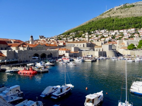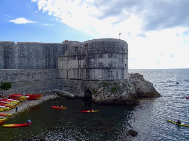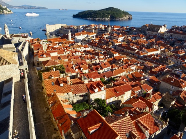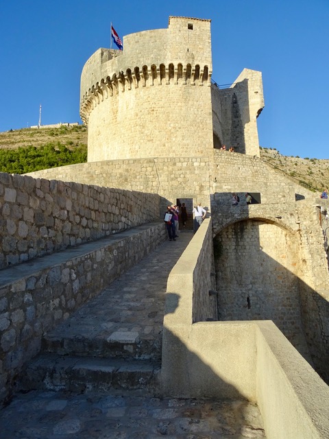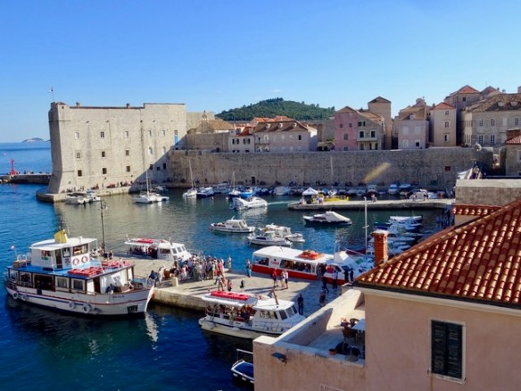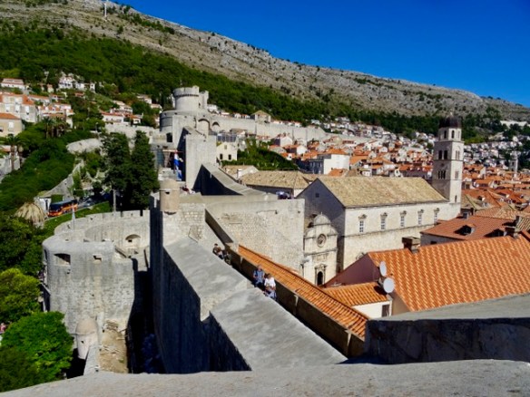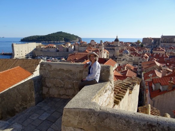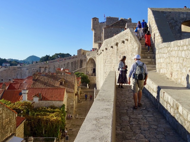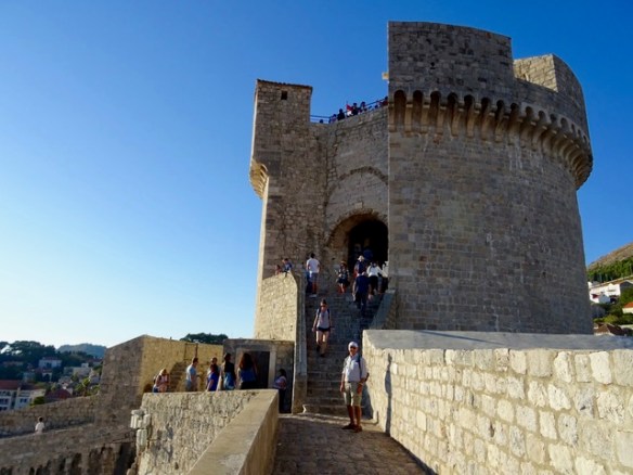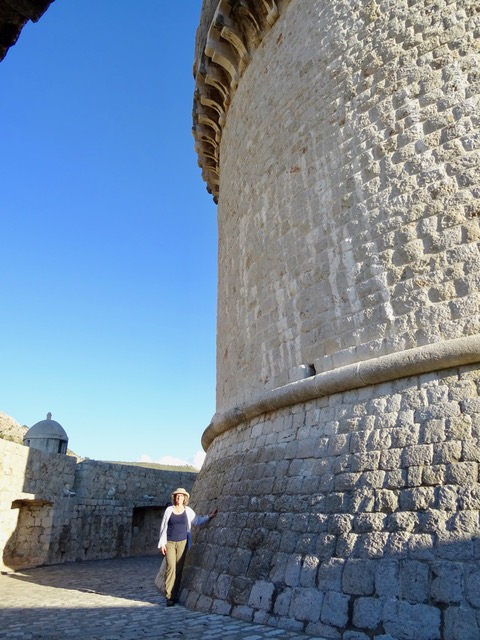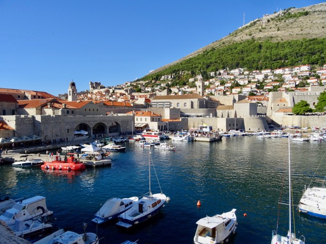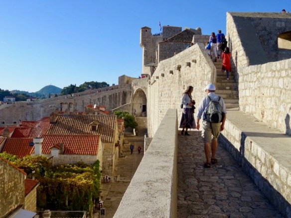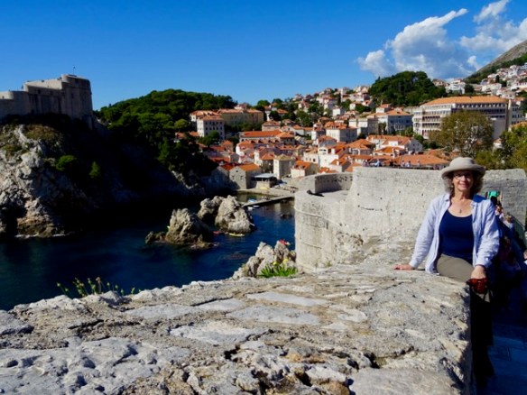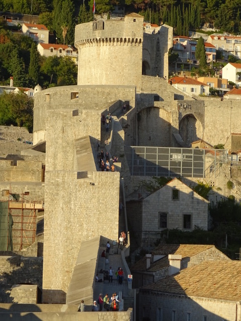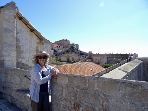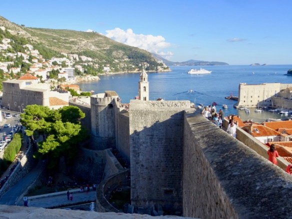We walked the walls around Dubrovnik today and I took 360 photos! Don’t worry, I am not posting them all but it sure was hard to choose only a few.  Dubrovnik, a UNESCO World Heritage Site, is an ancient city surrounded by medieval walls that are almost two kilometres long. Our first view of the walls is impressive.This is the Stradum, the main street of Old Dubrovnik.Soon we are up on the walls ready to start our walk. the guide books say that most people spend one to one and a half hours here, but we spend four hours walking the walls and enjoying the views.The walls are up to 125 m high and 6 m thick!This is one ladder I won’t be climbing!The walls enclosed and protected the buildings of the stari grad, or old town.Dubrovnik is not just a tourist attraction, it is home to many and we see potted gardens and laundry drying all around town.The harbour is full of boats of every type.Looking out towards the new part of town…and back towards the harbour.I just love all the domes and towers…