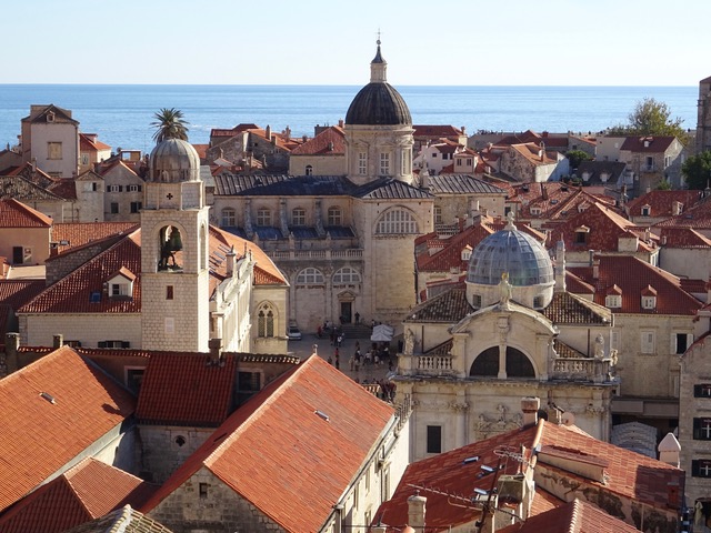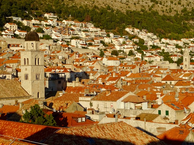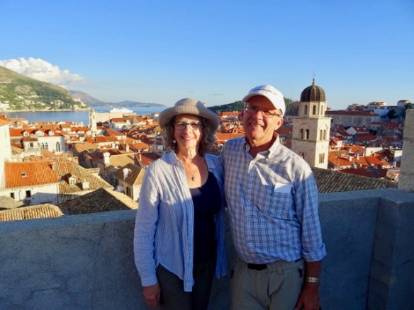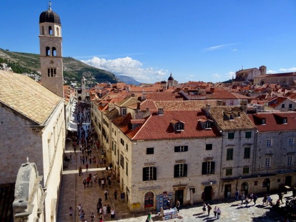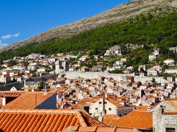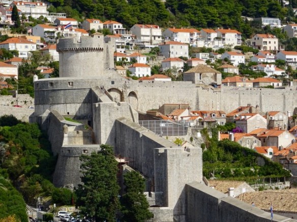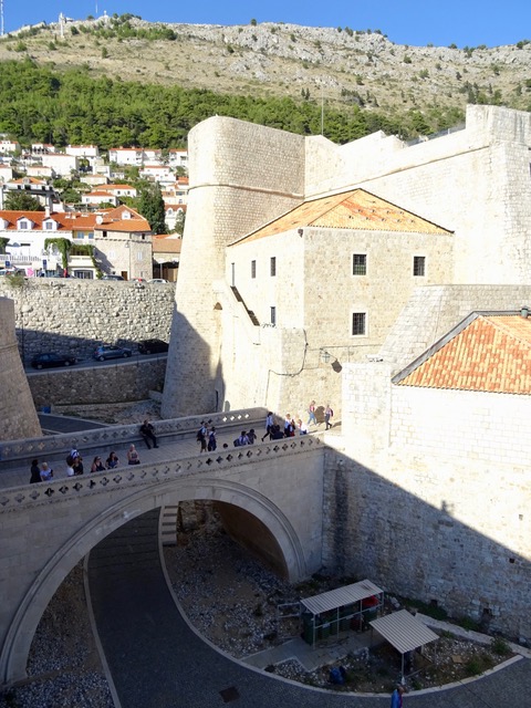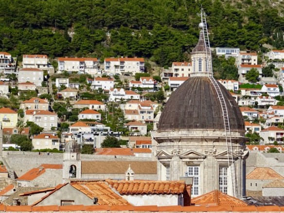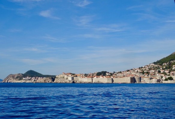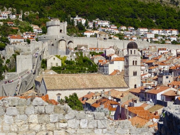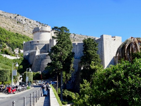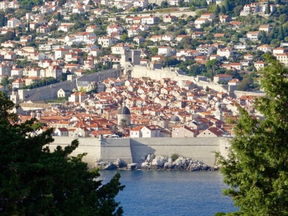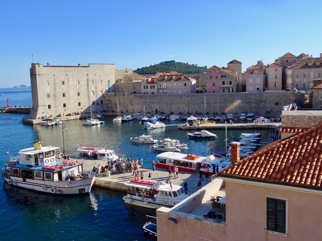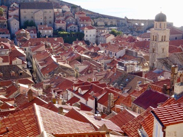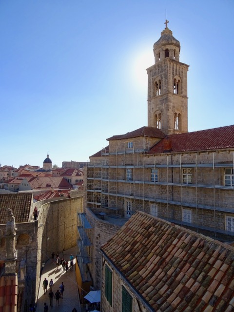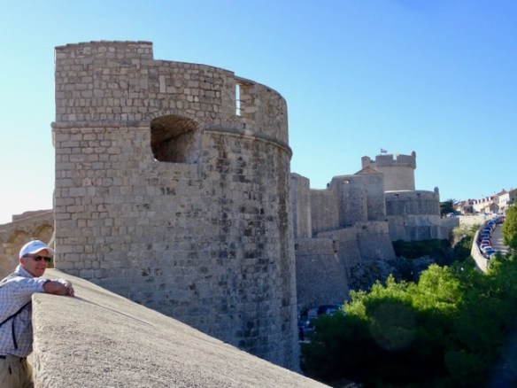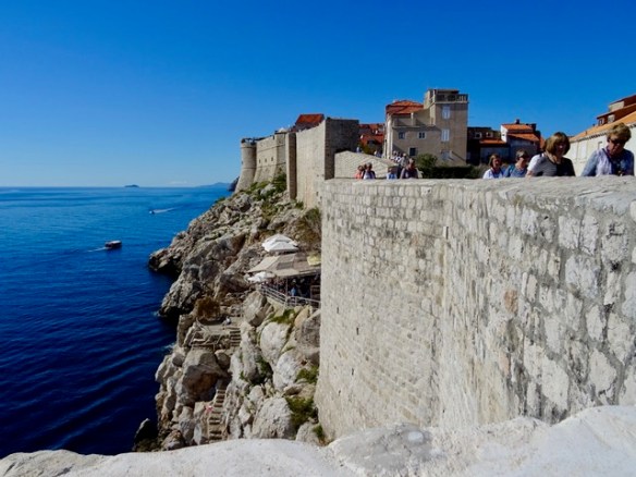 We walked the walls around Dubrovnik today and I took 360 photos! Don’t worry, I am not posting them all but it sure was hard to choose only a few.  Dubrovnik, a UNESCO World Heritage Site, is an ancient city surrounded by medieval walls that are almost two kilometres long. Our first view of the walls is impressive.This is the Stradum, the main street of Old Dubrovnik.Soon we are up on the walls ready to start our walk. the guide books say that most people spend one to one and a half hours here, but we spend four hours walking the walls and enjoying the views.The walls are up to 125 m high and 6 m thick!This is one ladder I won’t be climbing!The walls enclosed and protected the buildings of the stari grad, or old town.Dubrovnik is not just a tourist attraction, it is home to many and we see potted gardens and laundry drying all around town.The harbour is full of boats of every type.Looking out towards the new part of town…and back towards the harbour.I just love all the domes and towers…