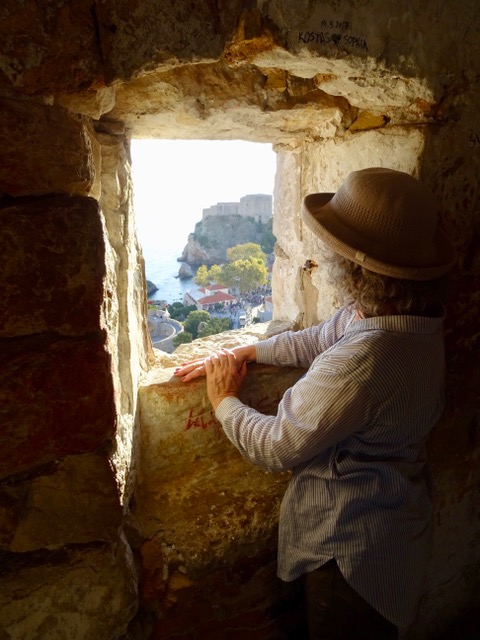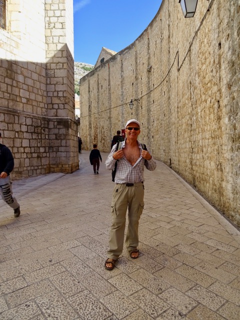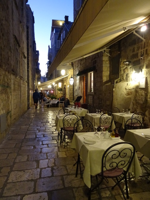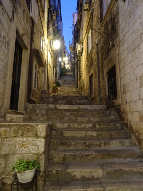 and the narrow streets with all the steps…and the chimneys…and all the tile roofs. I guess I just love all of it!I googled and discovered that walking the walls involves climbing 1080 steps… but the views are worth every single one.A woman told me that this was a cute picture and offered to take it for me.This tower was featured in the Game of Thrones. There are a lot of sites from the show in Dubrovnik and we intend to find some of them this week.As the sun began to set, the colours changed.I retraced some of our steps at the beginning of the walk to take a few more pictures in the golden afternoon sun and Bob waited for me.  Can you spot him?As the sun set the lights came on and the narrow side street looked even more interesting.Every space is used  and many of the streets are lined with tables waiting for dinner customers, but we head home.  We have been walking for eight hours and we are both tired.