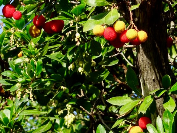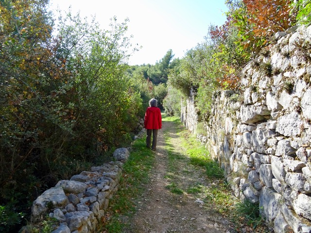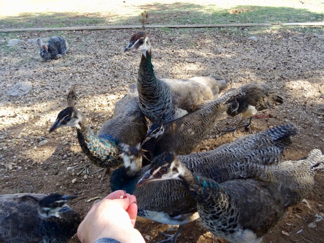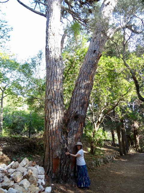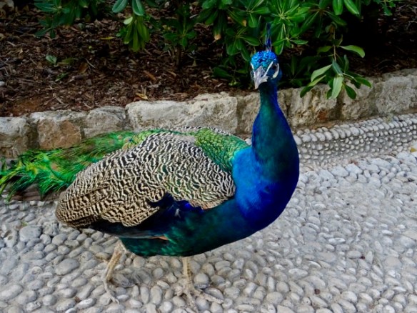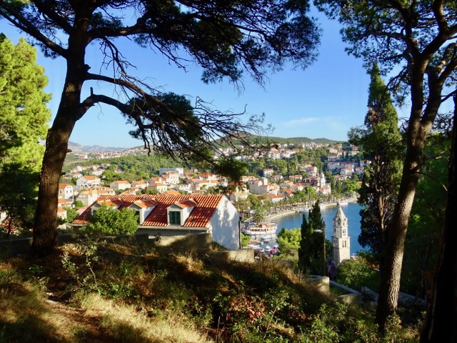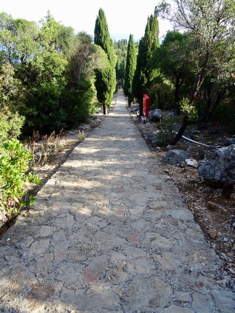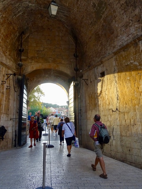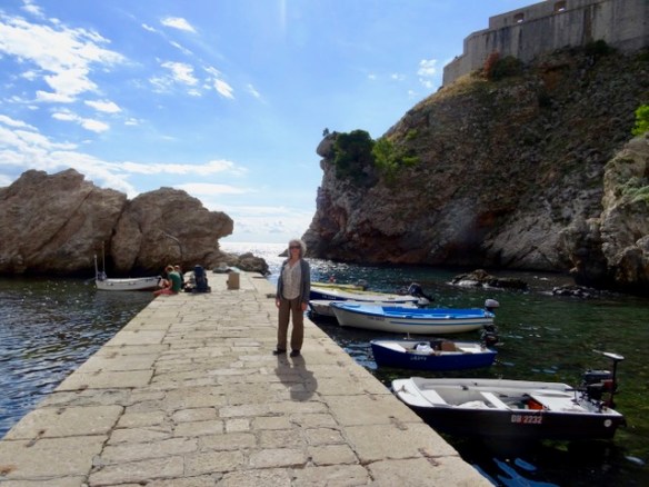 a tree that needed a hug.This photo of the Path of Paradise, or the Celestial Way, doesn’t really show how steep it is, but it is a very long uphill path to Fort Royale, also known as the Tower of Maximilian. Those are people way down at the bottom and we are still only about two thirds of the way to the top.The view from the top is worth the climb.  Those rocks people sunbathe on are way down  on the part of the island that sticks out into the sea.That is Dubrovnik in the distance and…Here is a close up of the old walled town and the walls we walked on…and here is the tower. I was surprised that we are able to go inside, and we both had a laugh when we saw the toilets which are on the top of the tower.Does anyone know what these fruits are?  They are about the size of a large cherry.There are peacocks everywhere on the island. They were imported from the Canary Islands about 150 years ago.The Botanical gardens were the location of the City of Qarth in the Game of Thrones but many of the plantings were damaged last winter by cold weather and high winds and it looks pretty sad now. Only the bigger sturdier plants seemed to have survived. It was actually a very disappointing botanical garden.Soon it is time to return to Dubrovnik. No one is allowed to spend the night on the island because it was cursed by Benedictine monks who were forced to leave the island  by a French Army General. They spent their last night there walking three times around the island with candles carried upside down so that the molten wax left a trail. As they walked they chanted “Whosoever claims Lokrum for his own personal pleasure shall be damned!” At dawn they left and the curse did its work. Every new owner of the island suffered misfortune of some kind including death, murder, bankruptcy, earthquakes, and shipwrecks. As we return to Dubrovnik we see lots of  boats heading out of the harbour.Here we are walking towards the entrance to the walled city…and we pass through the gate with its massive doors one last time. Although we spent a week here we could easily have spent even more time in this enchanting city.
