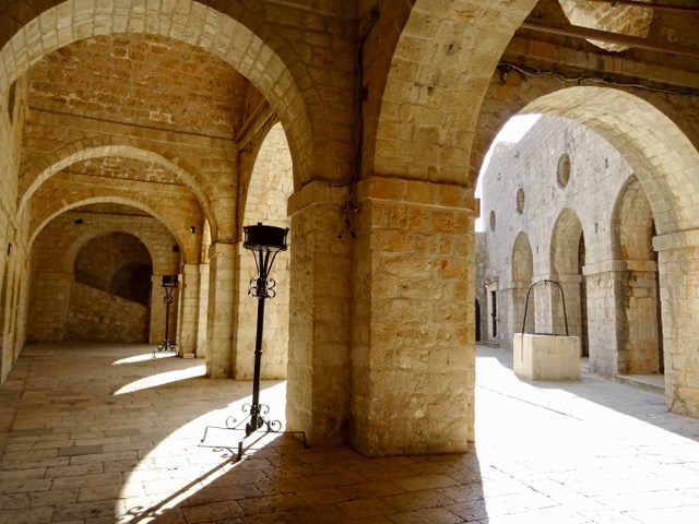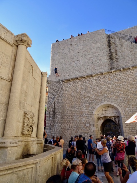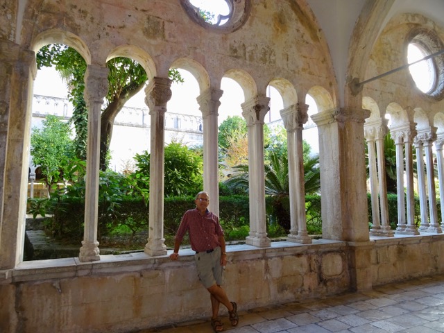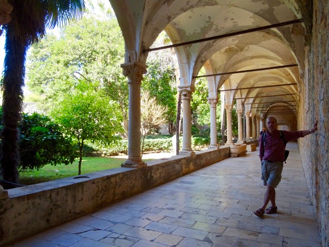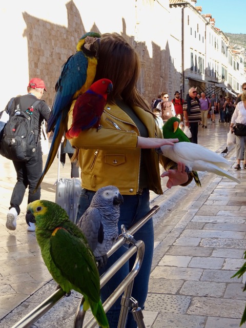 The streets here are so old.We stop for ice cream and some people watching. Men and women are rappelling down the city walls…and getting their photos taken with these exotic birds.The Friars Franciscan Monastery Museum has the oldest operating pharmacy in Europe and a beautiful garden cloister.