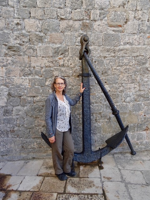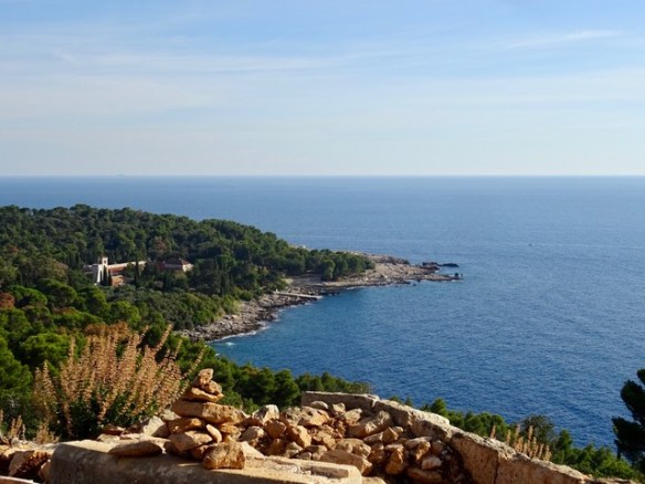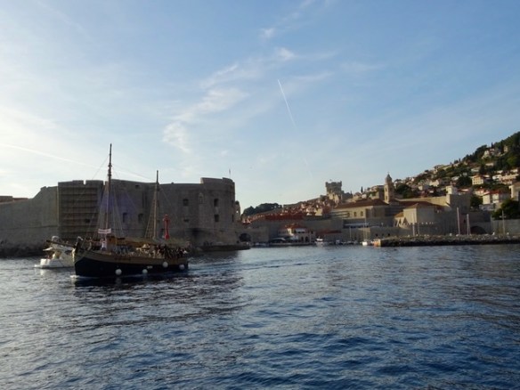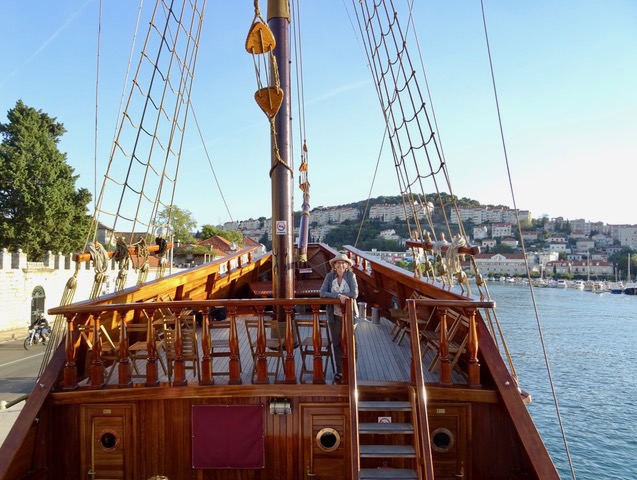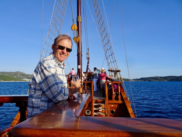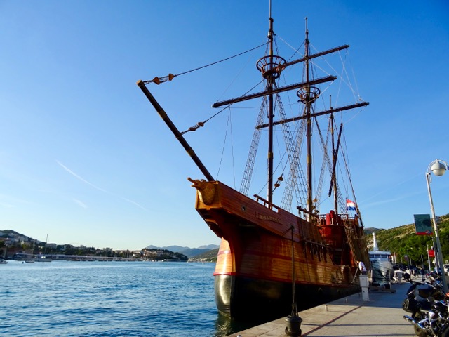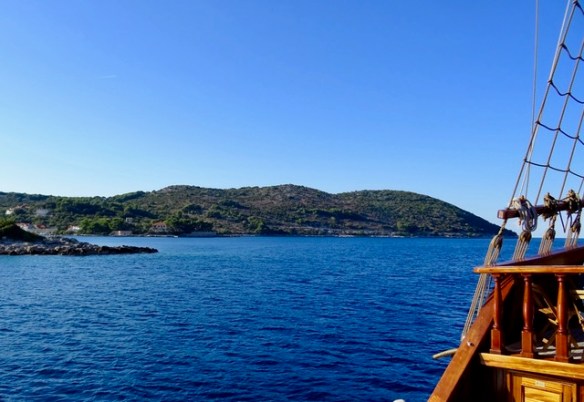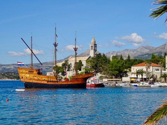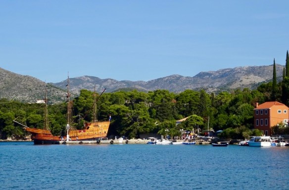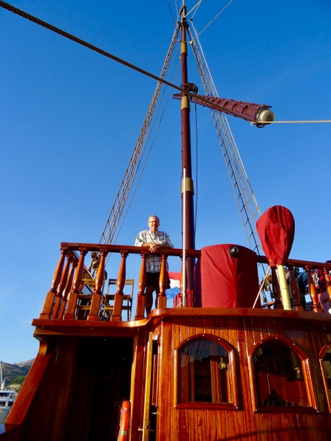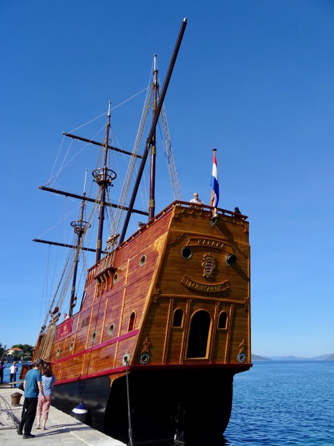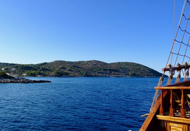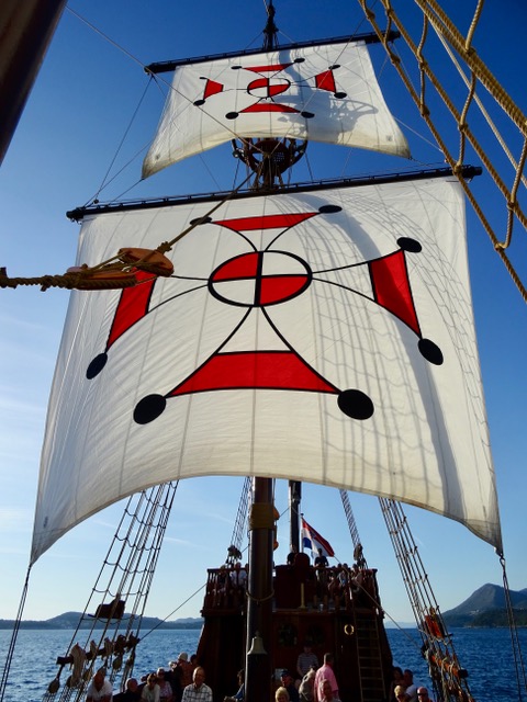 We set sail at 9:00 am on the Karaka, a replica of a historical ship, an important trade vessel that sailed between the 14th and 17th Century. In the 16th Century the Karaka was one of the largest ships in the world. But perhaps more importantly, the Karaka was used in the third season of Game of Thrones. The captain tells us that all the ships in Season Three are this ship with computer enhanced modifications.  The morning starts out quite windy so we are glad that we brought our coats along. We pass some of the 1,244 islands that are part of Croatia but we learned today that only 48 of them are inhabited.First stop is the island of Koločep, which only has 163 residents, There are no cars or trucks are on the island because there are no roads wide enough for them, but we do see motorbikes and golf carts. We only have about an hour here, so we walk to this little church and cemetery dedicated to St. Nicholas that was built in the 10th Century. There was another church we tried to visit but we couldn’t find it so we head back to the ship…