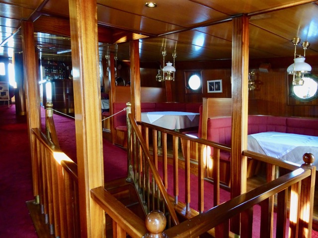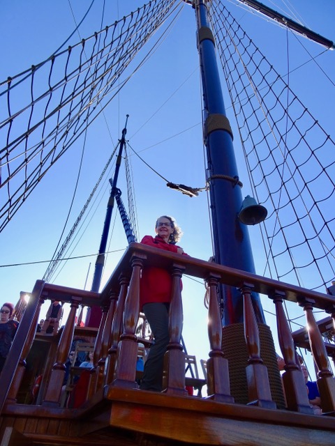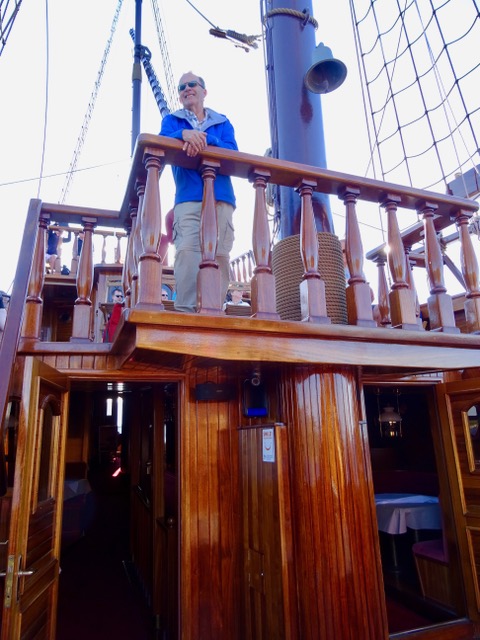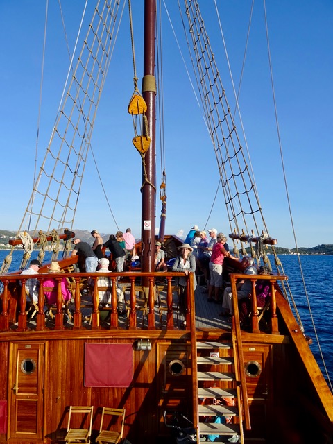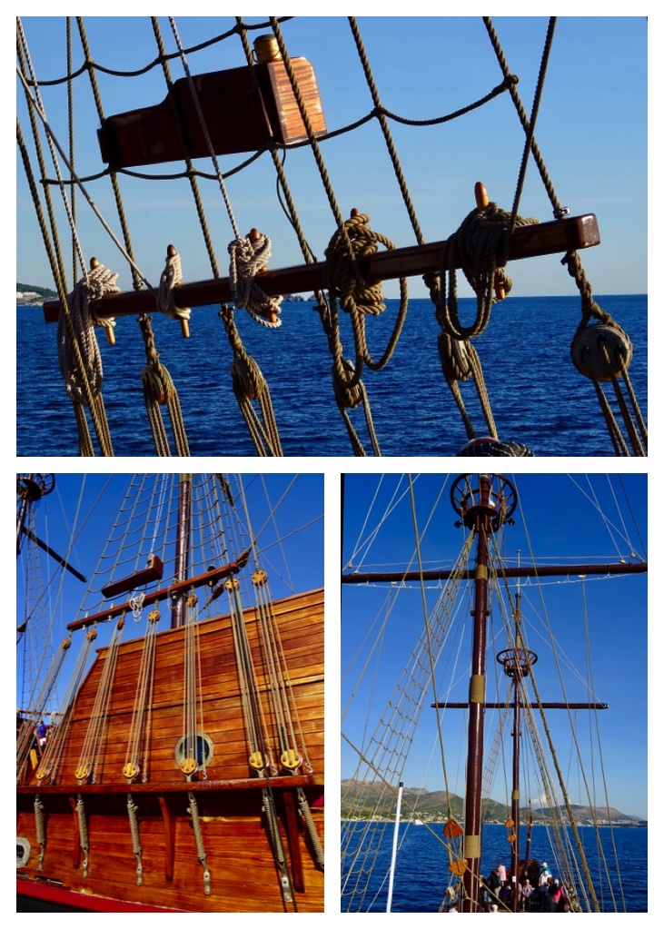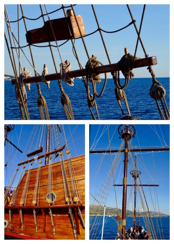 There is fresh fruit for dessert  and a variety of alcoholic drinks on our return trip. The wind has died down and it is a beautiful calm day..We leave a trail in the sea behind us.Our guide told us that the engines had stopped and teased that we would all have to jump into the sea and push the boat, but then the sails were lowered!  I was so surprised, I didn’t expect that the sails would be used, but there we were, wind powered and gliding silently over the waves. It was magical. This is a view of the dining area on the ship. Here is some of the rigging on the ship.We are the last ones off the boat so that we can take just a couple more photos without so many other people. We had an absolutely wonderful day.