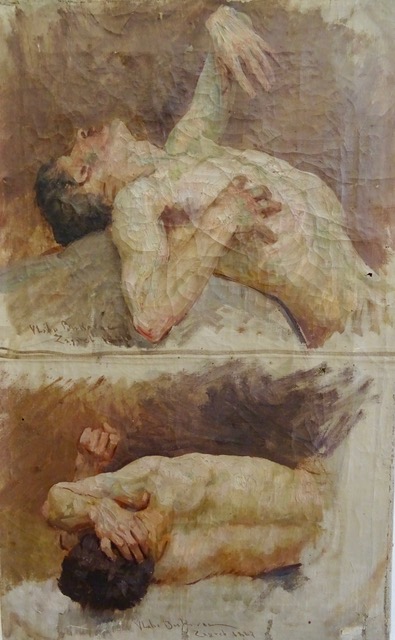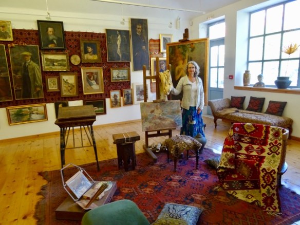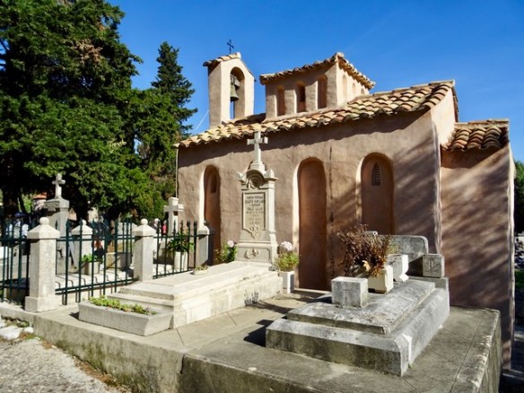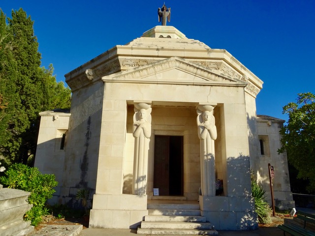 We spend the day at a little coastal town named Cavtat, which is about a 35 minute bus ride from our apartment. Here is Main Street Cavtat…which is the birthplace and home of one of Croatia’s most famous artists Vlaho Bukovac, (1855-1922). As a young artist he painted the walls of his parent’s home.Here is the view from a room at the front of the house.His studio was on the fourth floor, with huge north facing windows. It is a beautiful atelier…with a ‘modern’ bathroom!I really like his paintings and studies. Next we climb high above the town to the Račić Family Mausoleum. This family mausoleum now serves as a chapel for the town cemetery. The father, son, and daughter all died from the Spanish flu just a day before the son was to be married.  Račić’s widow ordered the mausoleum built and then she died from grief a year after her family’s deaths. The interior is amazing, the inside of the dome is decorated with 136 heads of angels.A view of the town from our walk down from the mausoleum.          Back in town we have ice cream and sit for a while along the water while I sketch the view below. You can just make out the mausoleum on the skyline.