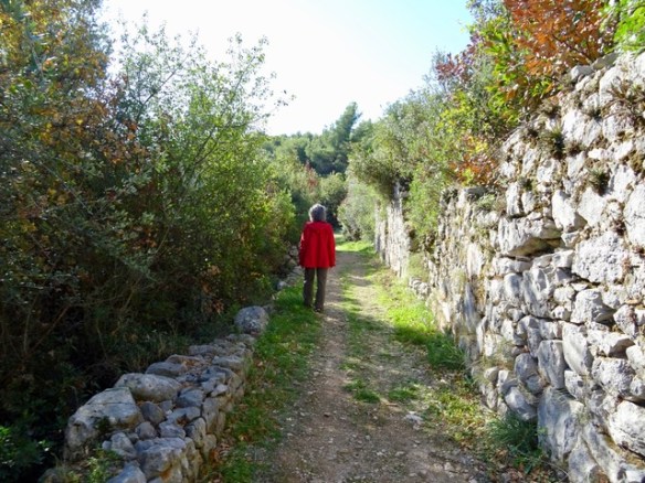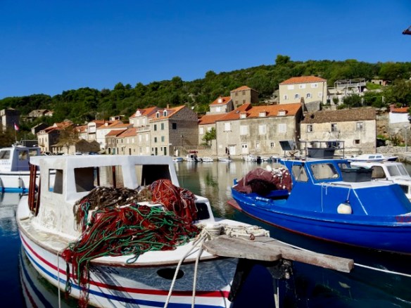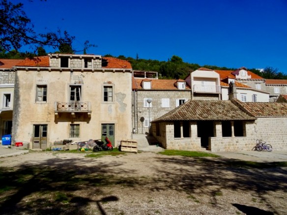 We walked about looking for an alpine hut that is supposed to be the lowest altitude alpine hut in the world. After climbing 122 steps up to the hut we discover that it is no longer an alpine hut but that it is now a private home.  The owner kindly let us come into her yard to take a couple photos. The hut is the white building with a red roof on the right hand side of the photo below. Seems nothing today is as we thought it was going to be!Here is the view from the ‘alpine hut’ and you can see the cement beach along the left side of the photo.While we were walking through the town I peered into an abandoned building and saw all this.  There are so many buildings in Croatia that are abandoned and empty, often falling into ruin. I wonder why?  Perhaps so many young people are leaving the smaller towns and heading to the cities to find work?  Sometimes we are so busy looking at the big things that we miss the little ones.  This plant growing by the steps down to the beach was covered with white snails.So, any guesses as to what this is?Our last stop for the day was the pretty little town of Stinica.  The new ferry port to the neighbouring islands is located here. You can just make out many stone walls in this photo. These walls are all over the hillsides, sometimes on very steep mountain sides and I wonder who built them and why?  Perhaps they are terraces for gardening but the ground is so very rocky everywhere it doesn’t seem likely. Sometimes they are on such steep hillsides that it would seem impossible to grow anything. I guess it remains a mystery for now.
