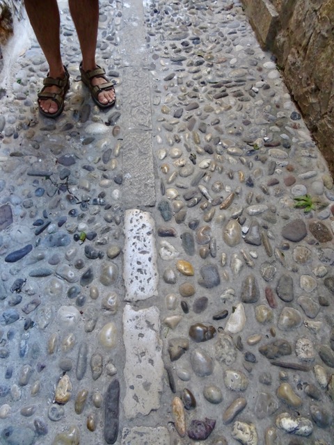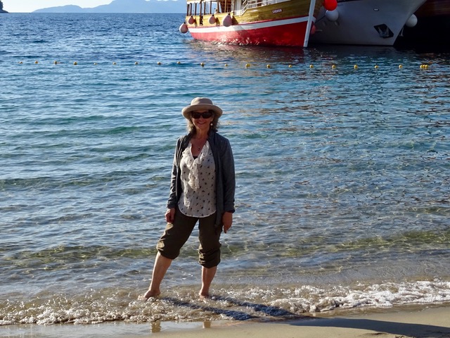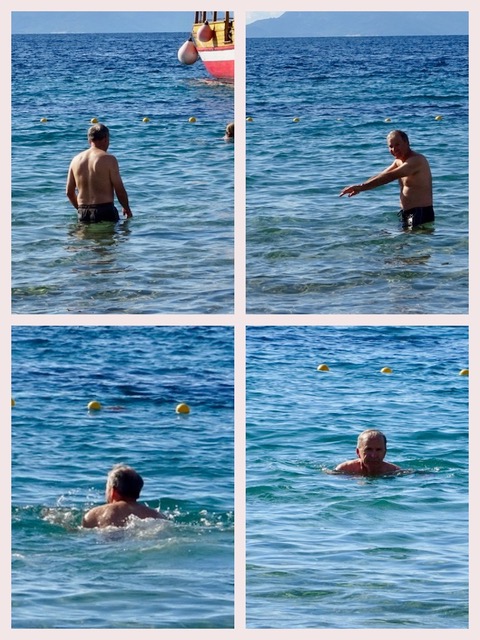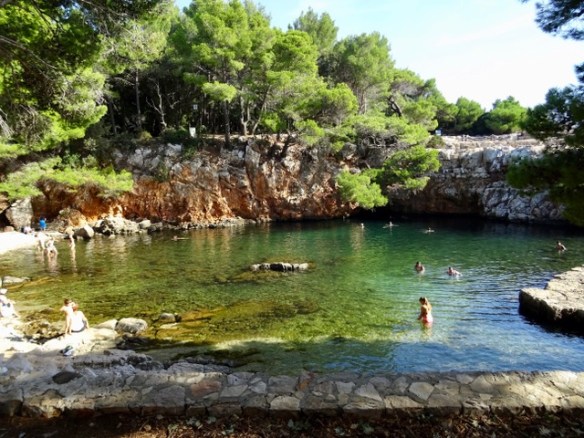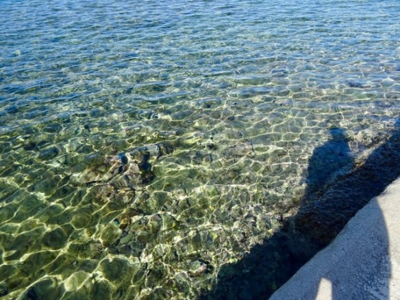 Starigrad was the next town but the road looks even narrower and has potholes so we decide not to even attempt it. We did make it to Jablanac, and headed to the beach for a late picnic lunch. The beach was cement! but the sun was shining and we enjoyed sitting and relaxing, watching people swim in the ocean and the boats going in and out. This photo is for my friend Pat. I told her I would dip my toe into the ocean for her today. The water was a bit cool but not too bad, and it was beautifully clear and clean.