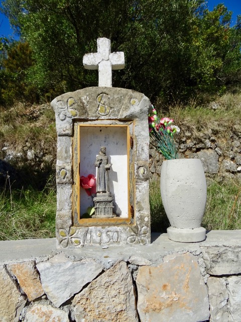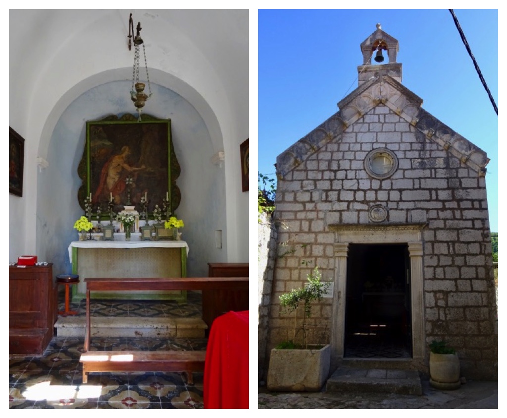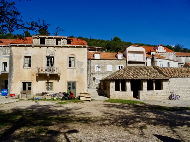 and stumble across this little church right down near the water.Our ship is waiting to head to Šipan, the second island on this Elaphite Island Cruise.The water here is crystal clear.Before we set sail I get a photo of Bob at the back of the ship.Soon we are on our way…and in just 30 minutes we arrive at Šipan which has a population of 436, but it has 37 churches and chapels! At one time there were 30 summer residences for wealthy families from Dubrovnik. Many of these are now abandoned, sometimes because of fighting within families. Read this interesting article to understand why there are so many abandoned buildings in Croatia, like the one in this photo.We climb the hill high above these houses looking for some of the many churches here but once again can’t find them, even though signs promise that they are just down the road. We have 90 minutes here so not a lot of time to go too far, and I don’t want the ship to leave without us!We did find this little road side shrine.