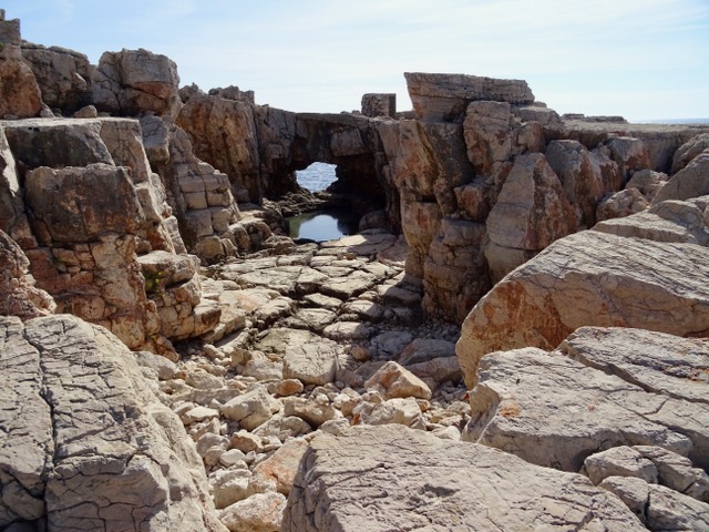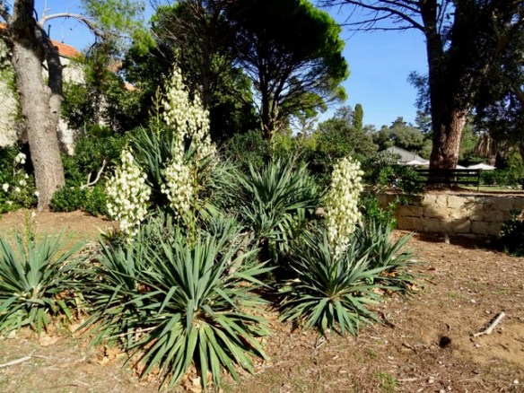 The cloister of the Benedictine Monastery.We find a bench in the gardens for our lunch but need to share our food with the local peacocks and bunnies. I have never seen young peacocks before, and now here they are eating out of my hand!  They do like rice cakes. I don’t know how all the rabbits found their way here but there are lots of them everywhere,A walk along the shore takes us to these strange rock formations which are a favourite place for sun bathing and swimming.We walk across this natural stone bridge, rather carefully as it wasn’t terribly wide.The well of Charlotte, an oval stone pool, was once used for bathing  and perhaps for watering exotic plants but it is now all dried up. It looked like a site for secret ceremonies, accompanied by strange creatures.The Dead Sea, is a little salt water filled lake linked to the open sea.On our way to Fort Royal which is on the highest point of the island we pass some of these flowering yuccas and …