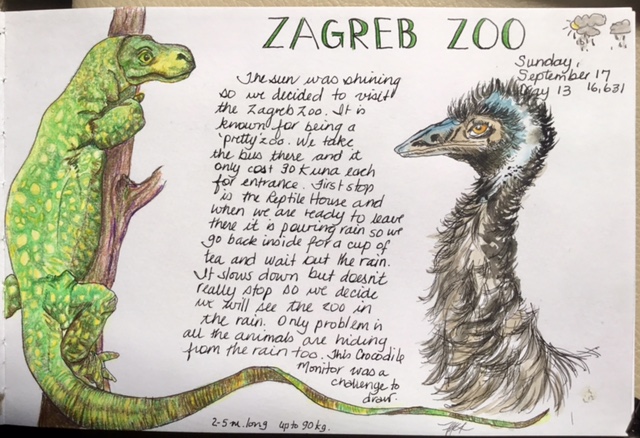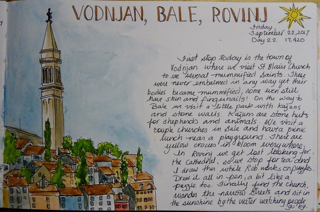 We are exactly halfway through our holiday and we have been having a really good time, but it is hard work too and I am starting to feel a bit weary.  Today I stayed home and Bob went out and about exploring. It was a grey day today with rain on and off so I think it was a good day to stay put. Here are a few more journal pages. The light wasn’t the best for photographing them but it will have to do.Strange how the pages look so different on the computer than they do in person. I don’t like them as well, the texture of the paper doesn’t show, sometimes the colour is a bit off,  and they tend to look ‘flatter’ that they really are.  I think perhaps if I was able to scan them they would look better but I can’t haul a scanner around with me! Too bad.I want to thank everyone who has taken the time to write a comment.  It is so nice to hear from readers of the blog. If you read a post perhaps you could take just moment to press the ‘Like’ button? I enjoy knowing that you liked the post.  Thanks.
