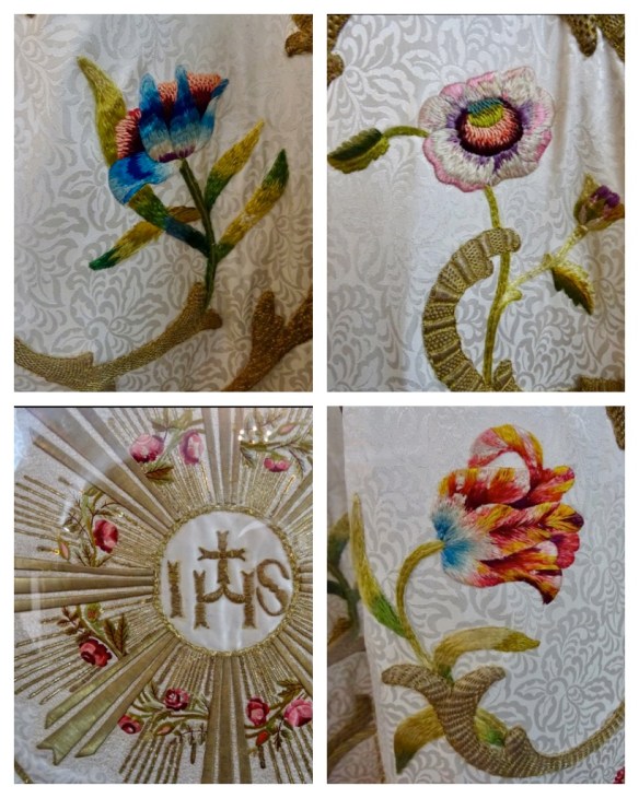 I think Bob has really become a gardener.  He started to weed the Bell Tower!The bells are very large and we are quite happy that they do not ring while we are up there.This is where we were standing in the last photo, in these archesThere are intricate floor mosaics from the 4th Century…and mosaics from the 6th Century cover the apse. They are incredibly detailed and very beautiful.There are nine Greek marble columns connected by arches on each side of the central nave.I really loved the way the light from the window shines on this Madonna.You might find this short video about the Basilicas interesting.Part of the Bishop’s Place in this complex has a little museum. The embroidery on these vestments was amazing…and I found this painting from the 15th Century very unusual. I will need to try to find out a bit more information about it.This depiction of the Crucifixion was from the 13th Century. I continue to be amazed that so many of these ancient works have survived all these years.This was a workroom off of one of the display rooms. I love peeking into these sorts of places. Here are some of Poreč’s streets.  We really enjoyed our time in this town.We sat in the sun having tea and watching some of the big yachts come and go. Their owners must have a lot with a lot more money than we do!On the way home we drive through some other small towns. We stop for a walk about in  Vrsar. Take a look the size of the boats docked here.This was something different to see.  Along the main road of a town called Flengi we saw  no fewer than twelve pigs being roasted in these big BBQ’s.
