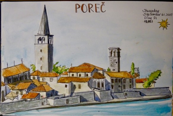 Finally, the sun is shining and it is a beautiful day! We drive to Poreč, which sounds like porridge, and spend most of the day exploring this Croatian Town.  The town’s main feature is a 6th Century Byzantine church, The Euphrasian Basilica.We climb these stairs, all 118 of them up to the bell tower for some great views of Poreč.