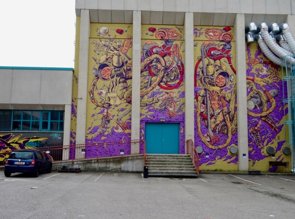 It took some time to find the bike rental company. They weren’t easy to locate. We pass this big mural during our search.