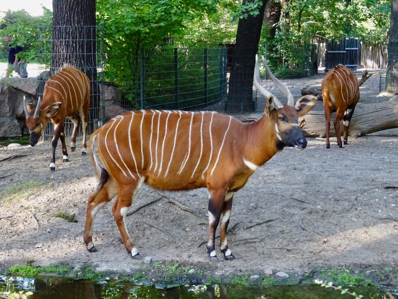 This was a new species for us, the Mountain Bongo. Their legs seemed too small for the bulk of their bodies, but they were very striking, with their white stripes agains their reddish hides. There are only 100 of these animals left in the wild! Interesting fact…the red pigment in their hides can bleed in the rain!