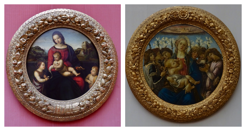 I finally get to see these two tondos in person, the one on the left by Raffael (34″ diameter) and the one on the right by Botticelli (54″ diameter). I particularly like the Botticelli, his Madonnas are always so beautiful.