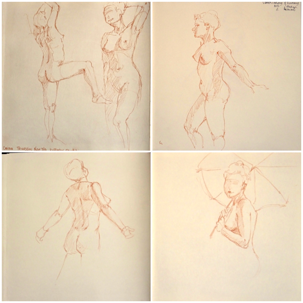 I have one more life drawing session tonight at Kaffeebar Quentin. I have attended many life drawing sessions in bars or pubs and the model is always at least partially clothed, so I was quite surprised when our model is completely nude. We are in the back of the bar, but the model is still in full view of all the other patrons as well as anyone who happens to look in the windows. Wish I had a scanner, as it would improve the quality of these photos, but I don’t think I can haul one around on holidays! These are all 5 minute poses.