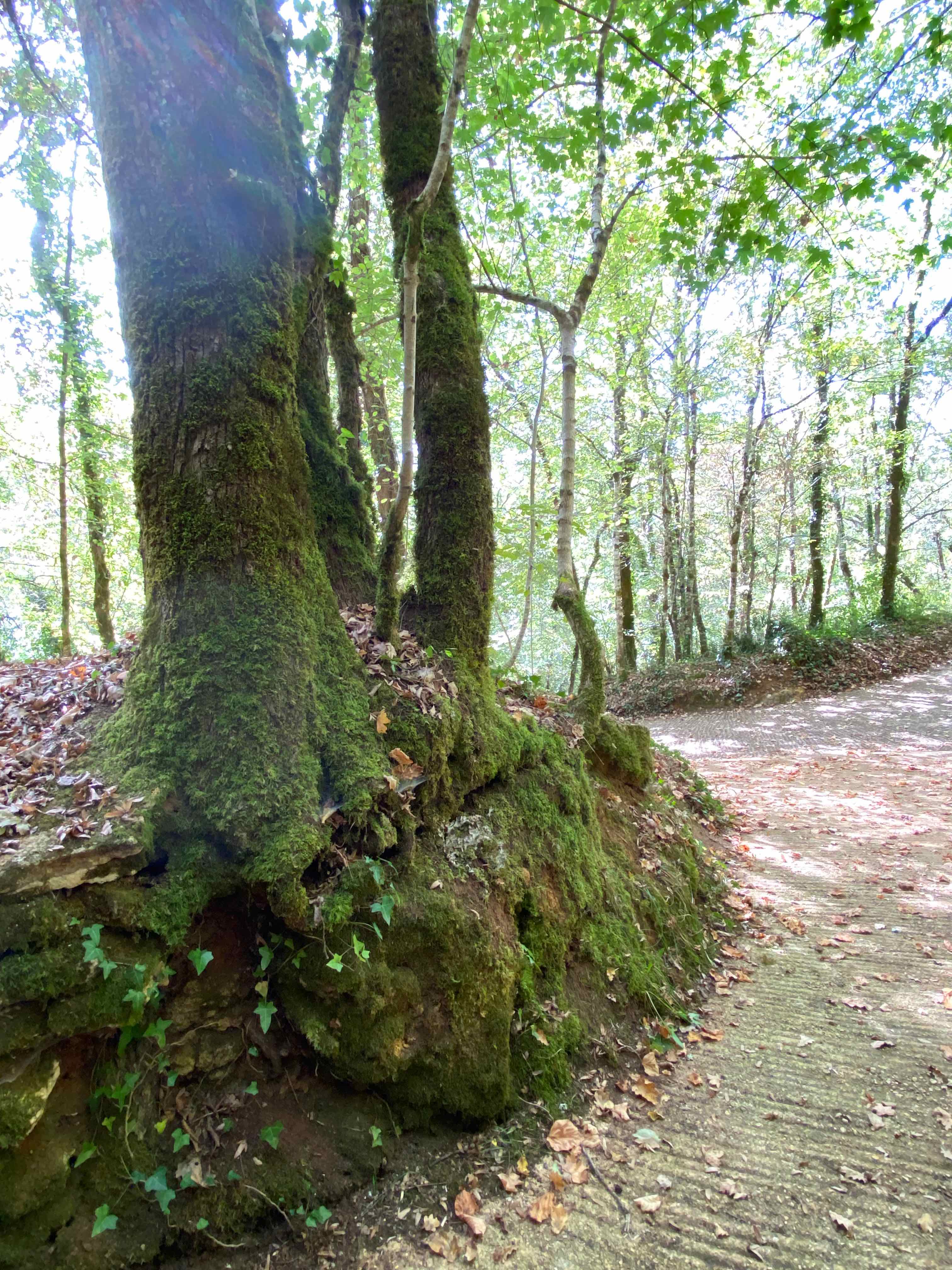There are some very large, very old trees along the way.  Bob is standing on the bridge just behind the tree.