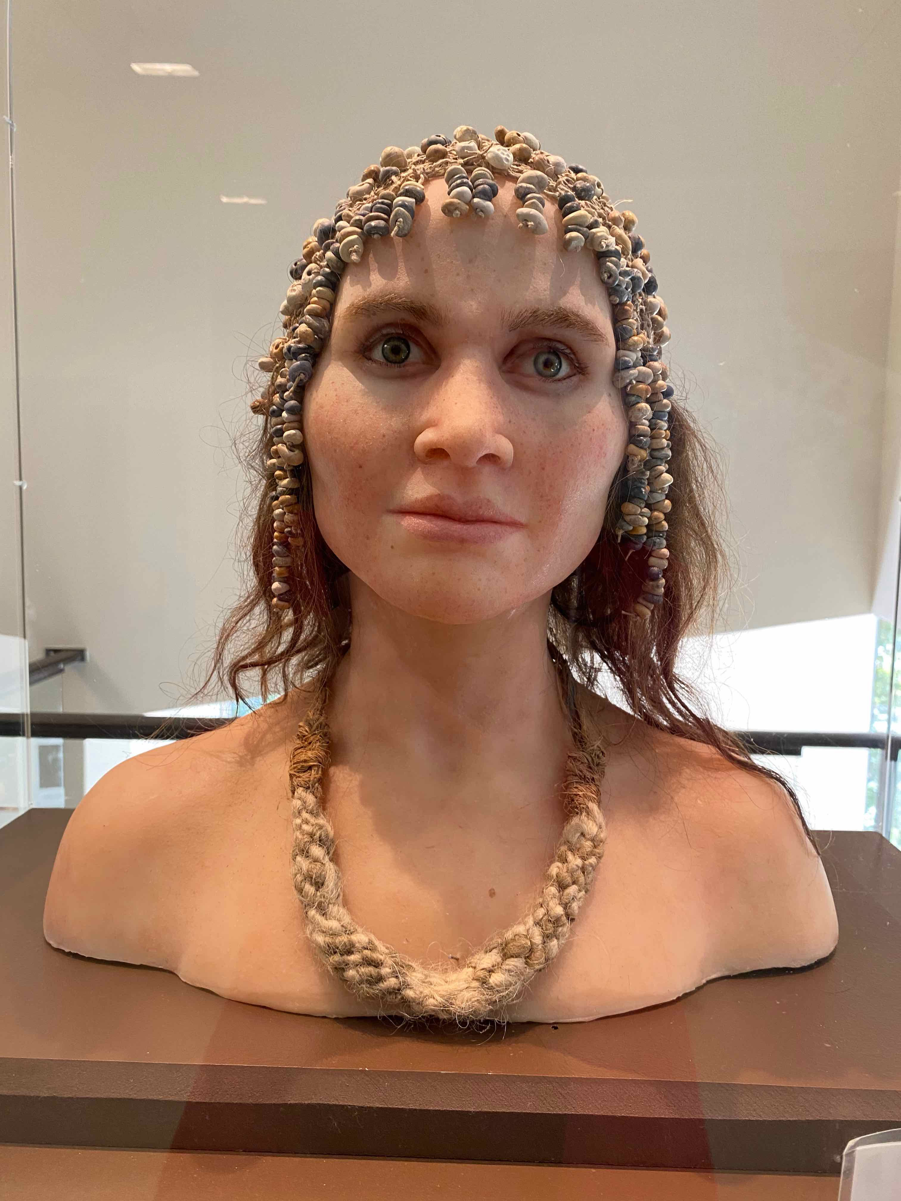 Here is a close up of one of the horses heads. I am amazed at how naturalistic they are, and the details that remain are amazing.  Unfortunately the bottom half of the frieze was carved in a softer limestone and has eroded so the legs of most of the animals are no longer visible. When the original site was discovered in 1909 part of the overhang had fallen down and dirt had built up so that most of the sculptures were covered. There was quite a lot of damage done to part of the frieze when it was being uncovered.  Pick axes were used to move the rock and dirt that had fallen down over the years and parts of the frieze were actually broken off by the very people who were trying to uncover it.  There were also notes made about the frieze being painted red, but the people who uncovered it decided to wash all the dirt off of the frieze and in doing so they washed off the red colouring!  Hard to believe, but archeology did not become systematic and disciplined in its approach to excavation until after the 1920’s.A scientist reconstructed the features of the skull that was found here.  I think she is quite beautiful and yes, much like a modern woman.  The jewellery is from an area near here but ti was not found with this skeleton.  Magdelenian man, or Cro-Magnon man is regarded as the closest ancestor to today’s humans.