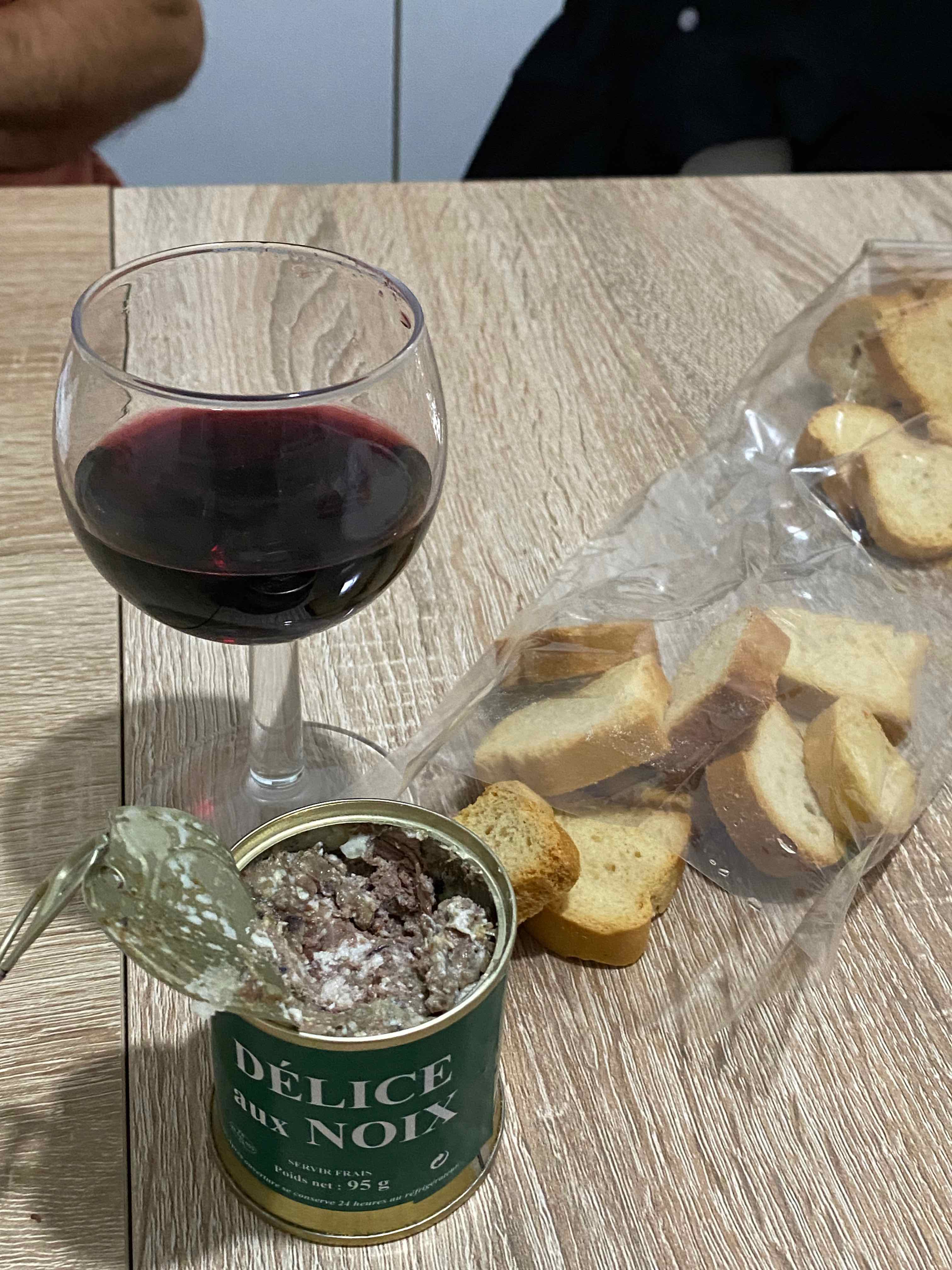 Back at our apartment Bob decides to taste the ingredients from our gift package.  Unfortunately, the foie gras with walnuts just isn’t very appealing.  It kind of looks like cat food and neither of us like it at all.