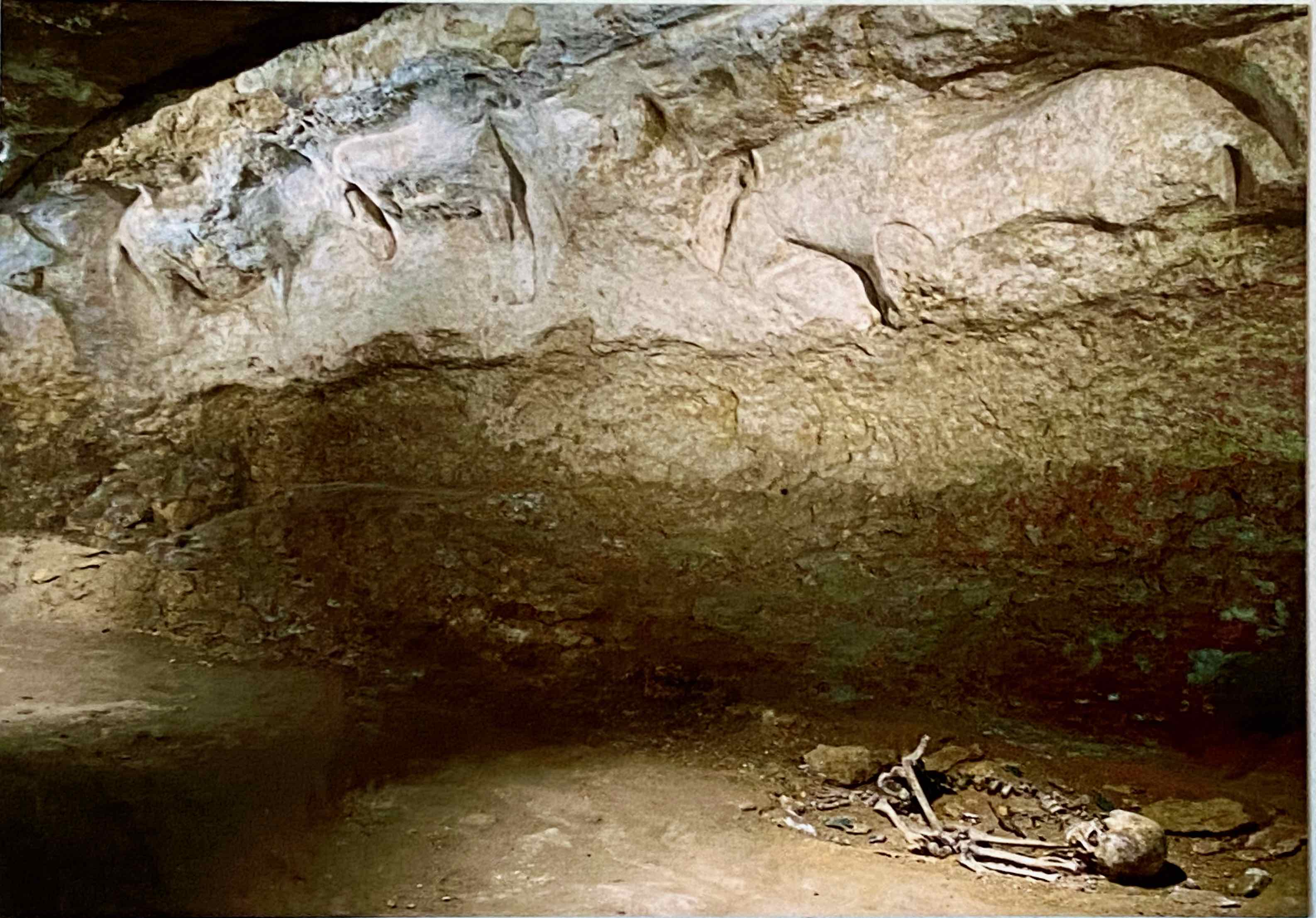 The skeleton on the ground is a replica of the one that was found when the owner of the site dug down to build a wall to protect the site in the early 1900’s.  It is a female, approximately 5’1″ tall and between 30 and 35 years of age.  The owner of the site sold the original skeleton to a museum in Chicago where it still resides.  It was first thought to be a young girl and the Chicago Museum called this skeleton Magdalenian Girl.  Only later were scientists able to determine more accurate information about this skeleton, which has been carbon dated and is 30,000 years old.  The frieze was made over 15,000 years ago, another 15,000 years after this woman was buried here.  She was found in a fetal position with three large flat stones carefully placed over her body.  A spear head was found with the body but there is no way to know if that was the cause of her death or not.  The farmer who found this did not know anything about how to preserve information at an archeological site.