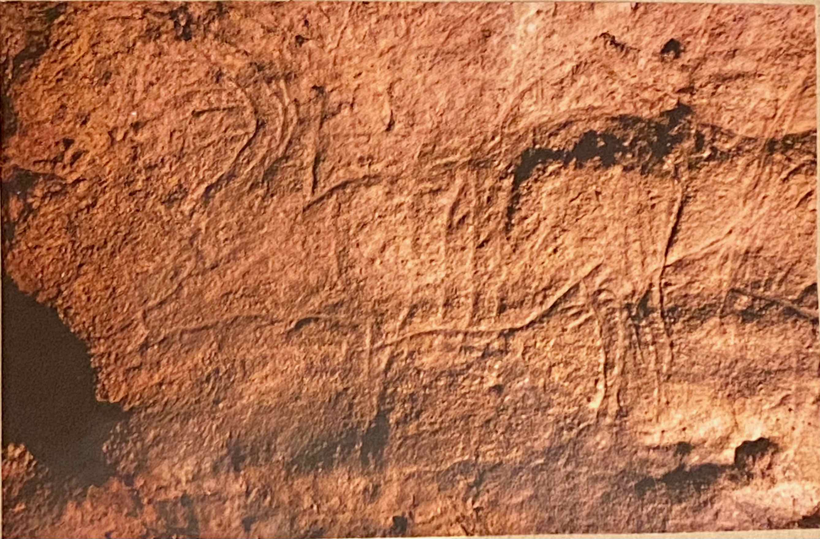 It is a long, narrow winding cave, 235 meters in length with no side channels.  A maximum  of seven people at a time are allowed in the cave because there just isn’t room for more than that to see the engravings in each location.  As it is we have to snuggle up so that we can all see the engravings pointed out by our guide.  This photo of a bison was in the office. The engravings are not always easy to see.