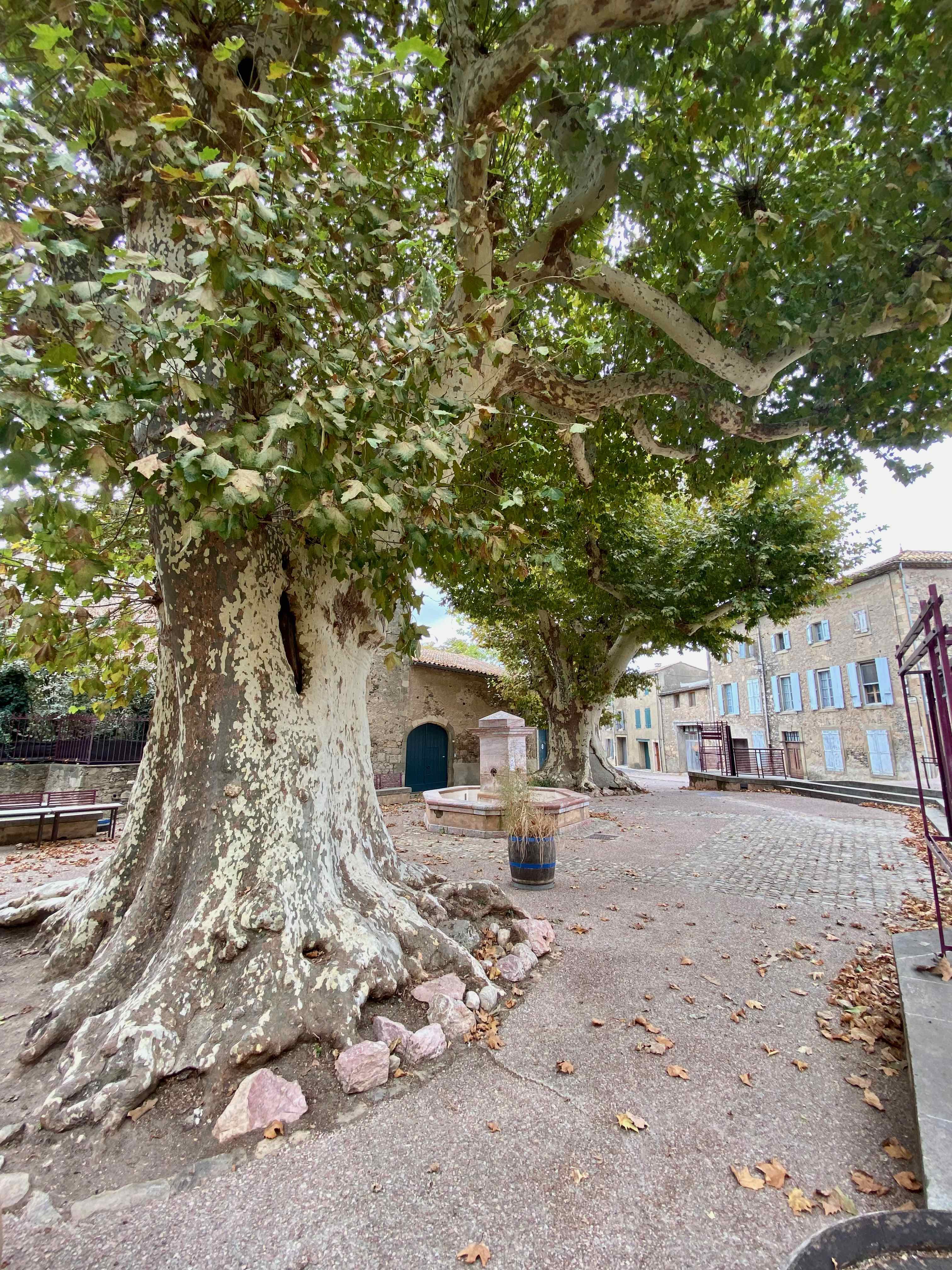 We walk into the town and turn the corner to find this lovely little park with an old fountain and the biggest Sycamore trees…or at least that is what I thought they were. The sign says that they are 200 year old Plane trees.   I do a bit of Googling and it seems that a Sycamore is a type of Plane tree or maybe a Plane tree is a type of Sycamore?   It isn’t clear but I am not going to spend any more time trying to figure it out.  Guess I need to start calling these trees Plane trees.
