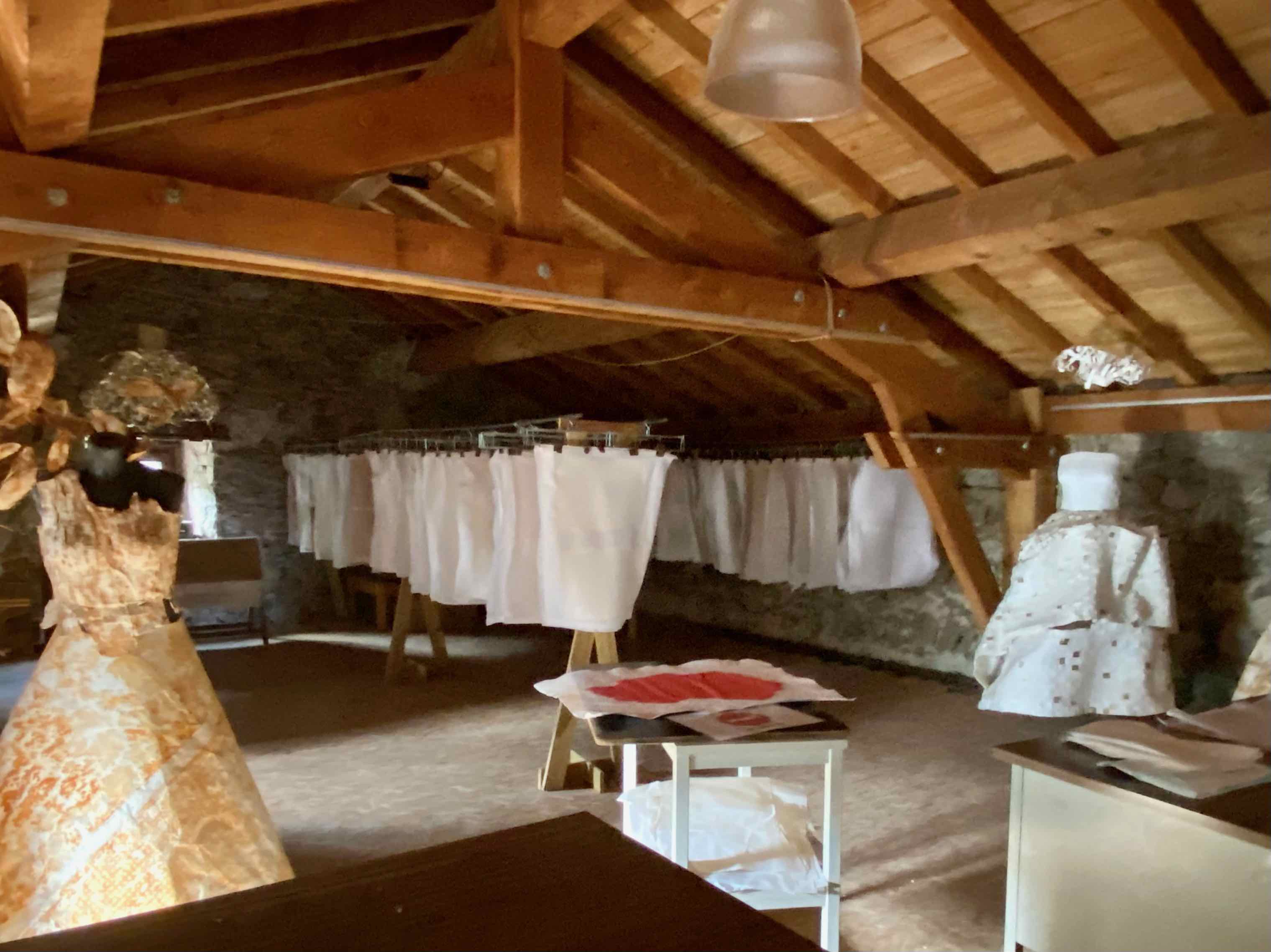 It took us a while to find the paper mill.  We had the wrong spot pinned on Google maps but we eventually sorted it out.  The Moulin à Papier, or Paper Mill in Broussess wasn’t what I was expecting.  It used to produce paper commercially but now the granddaughter runs the mill which has been in the family for seven generations.  They now make paper by hand using pretty much the same process that I use back home with our Paper Arts Guild.  After a sheet of paper is made it needs to be couched  (pronounced “cooched”)  or transfered to another surface. Here they have been couched onto synthetic interfacing, then pressed and hung to dry in the rafters. Every year, artist Catherine Cappeau makes a collection of paper dresses, which you can see on display in the paper mill.