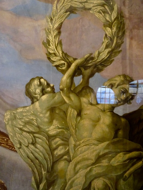 We have a great view of the dome paintings. It is interesting the way the gold highlights look up this close…