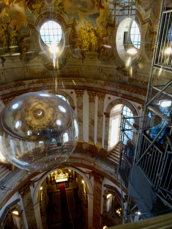 We had a huge surprise when we entered St. Charles Church. Two enormous floating mirrored balls that reflected the church…