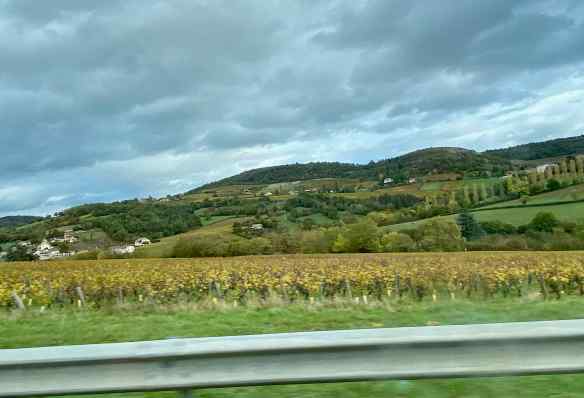 Today we are driving to Dijon with a stop in Cluny. It is cloudy and rainy today and we are surprised to see these sunflowers still in full bloom. They were finished and harvested over a month ago elsewhere.