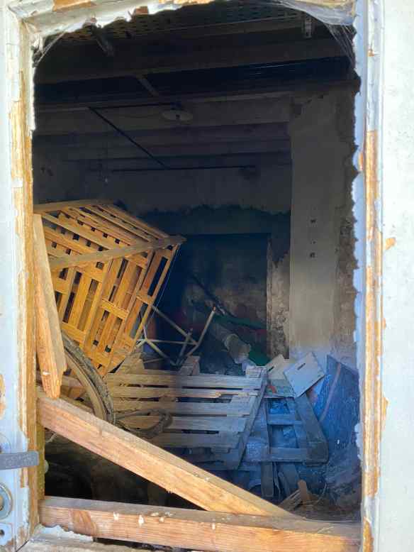 but when I hold my camera up to a broken panel in one of the doors along the cloister walkway this is what is inside! Not what I was expecting. I thought these doors would open into rooms but at least some of them seem to be storage rooms…for what looks like junk.