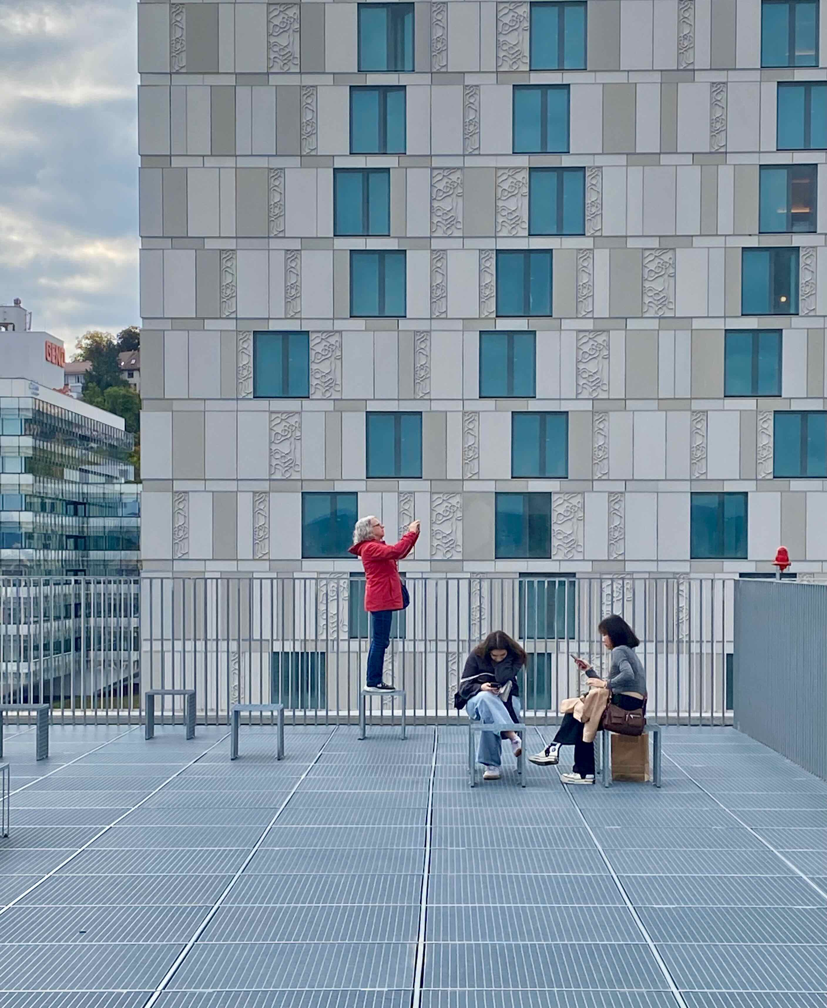 After tea and pastries we climb up to the viewing platform on the roof. I had to stand on one of these benches to get a view over the top of the double row of railings on the edge of the roof.