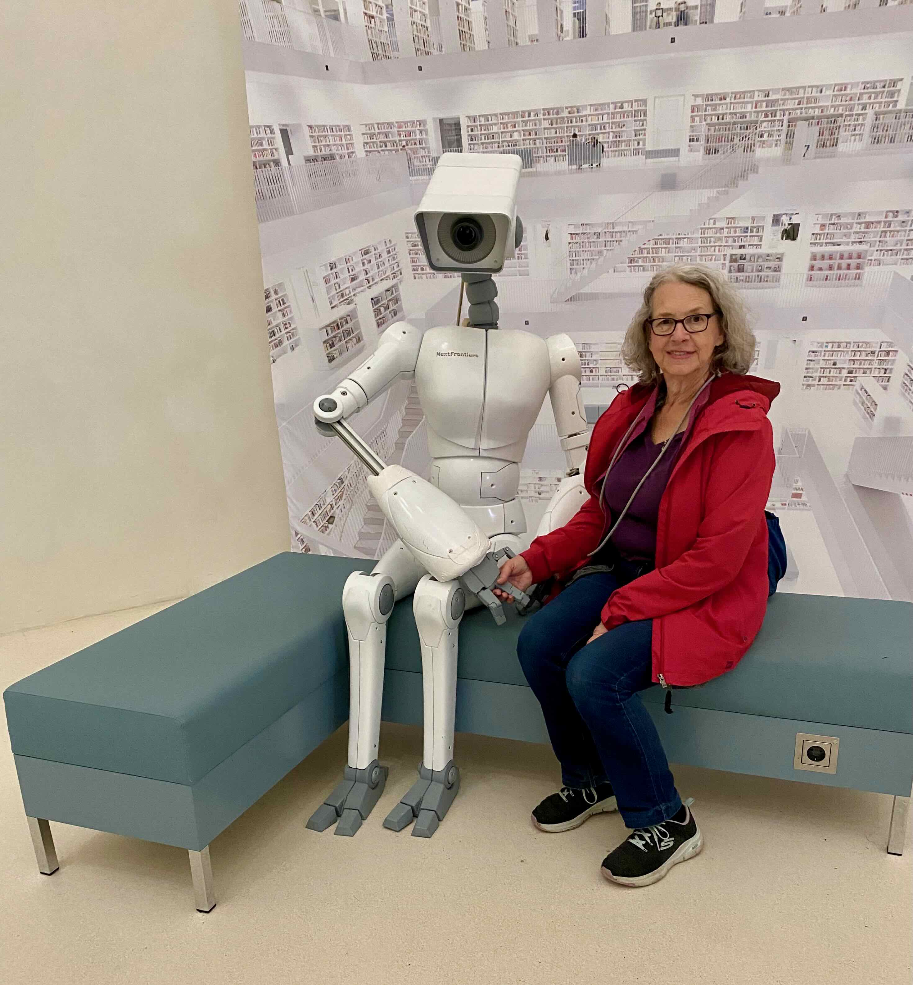 There is a robot exhibit on the main floor, so Bob asks this ‘talking head’ if there is a place that we can go and have tea and pastries in the library. The head answers in English that “The library has a cafe on the roof. Perfect to enjoy your tea with a view. It is a great spot to recharge. Enjoy your break with a dash of literature in the air.” He seemed to speak a least French, German and English…who knows what else? It is a little bit creepy though, as this head sitting on a table is quite lifelike!