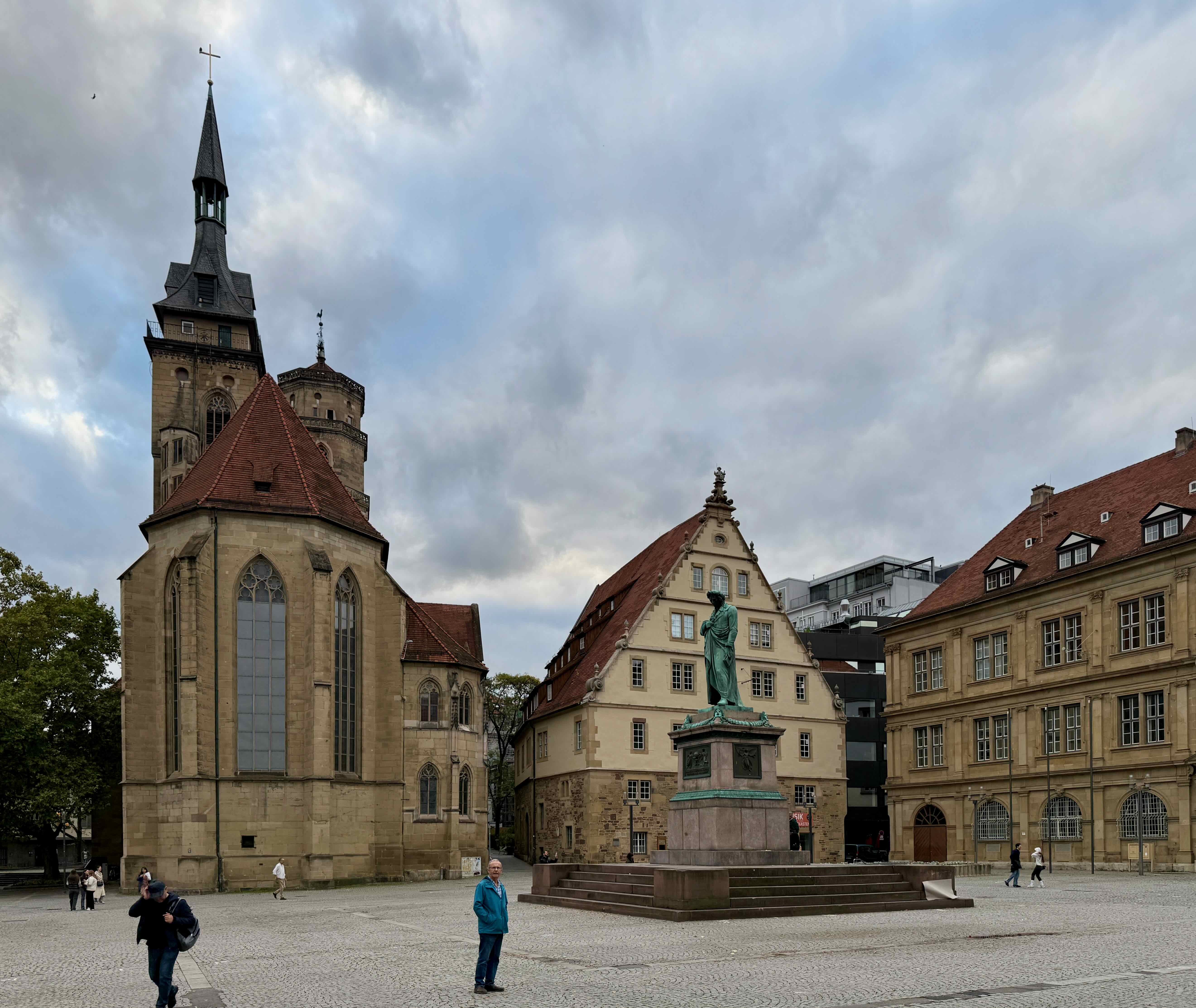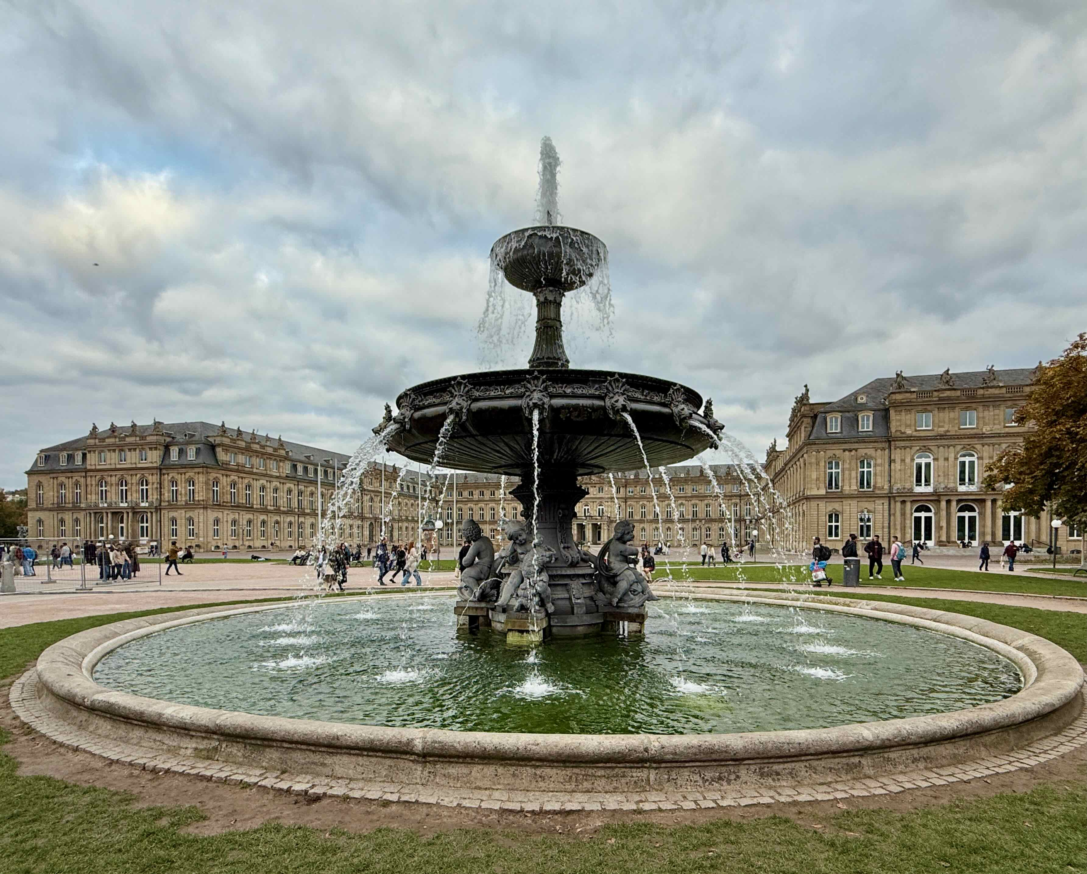 The buildings behind are the Neues Schloss, or the Grand Palace, which is now used as government offices.